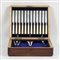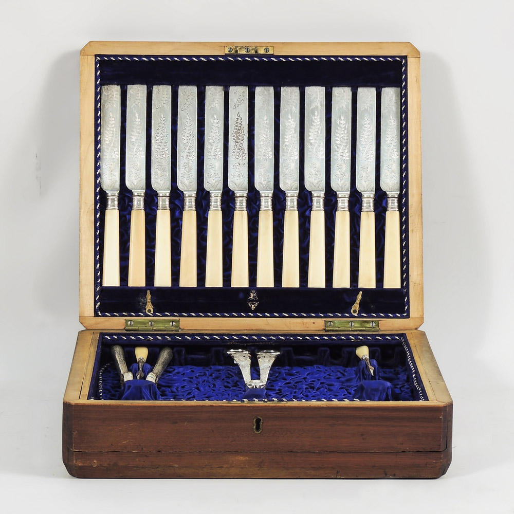 SERVITO DI POSATE DA FRUTTA IN SHEFFIELD completo per 12 persone, manici in avorio, corredato da due posate da portata, schiaccianoci con due piccoli attrezzi, entro scatola originale in noce, mancanze (30) SHEFFIELD AND IVORY FRUIT CUTLERY SET