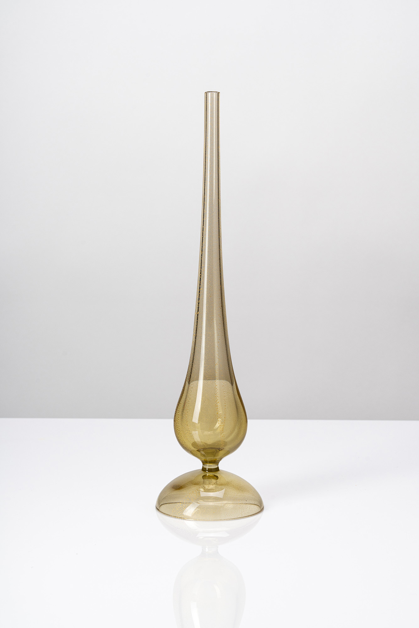 Vaso monofiore in vetro soffiato pagliesco con piede applicato e decoro a foglia d'oro