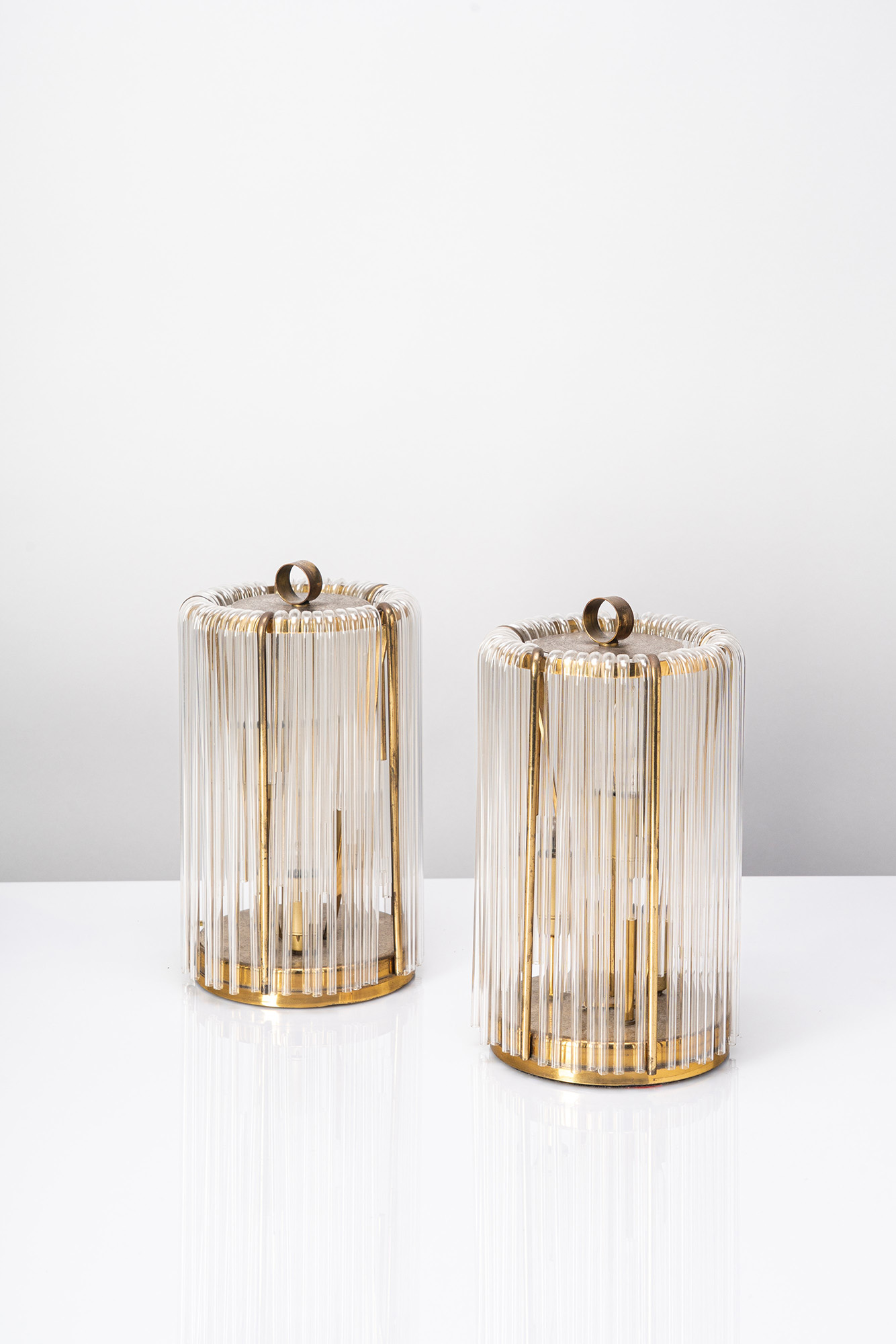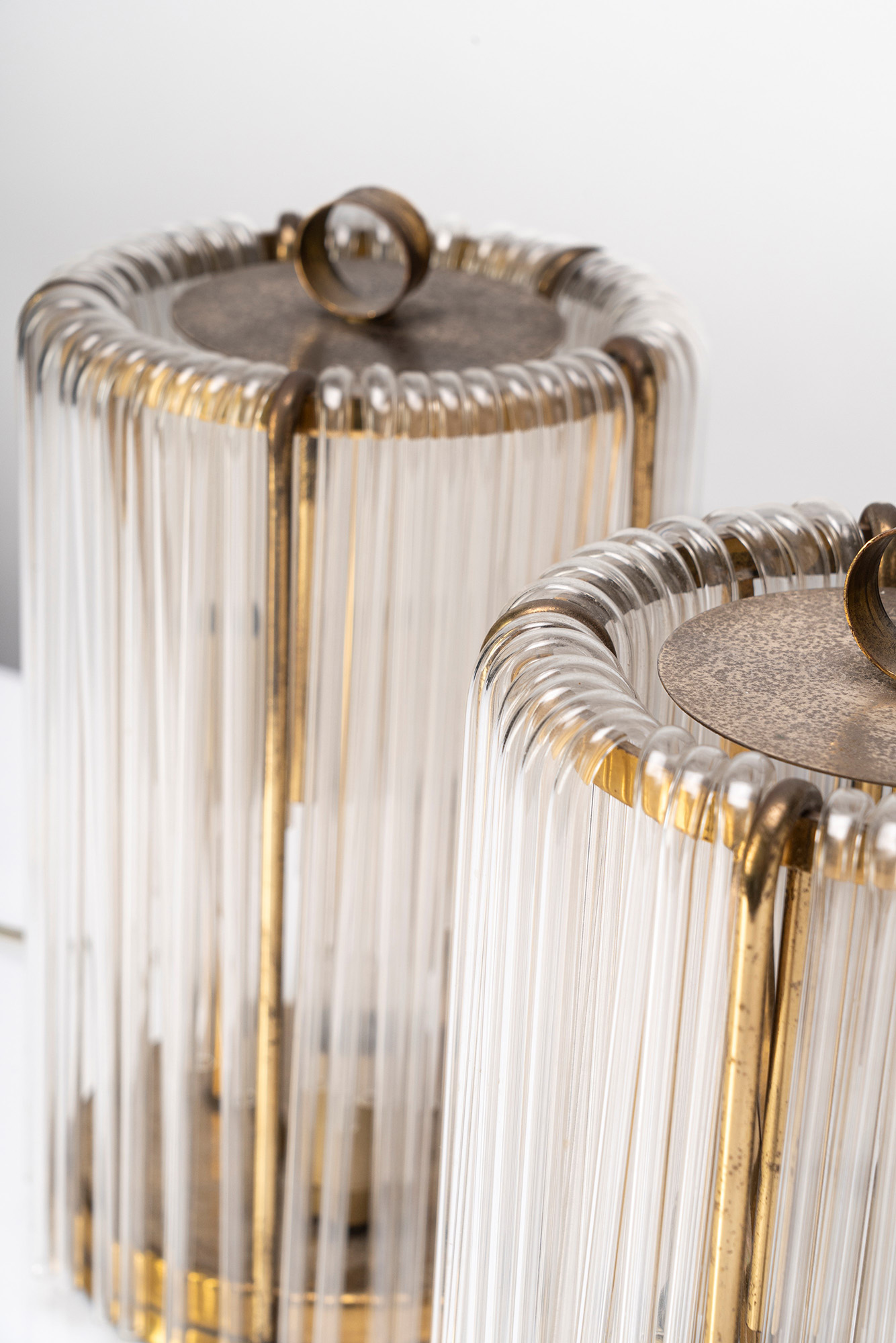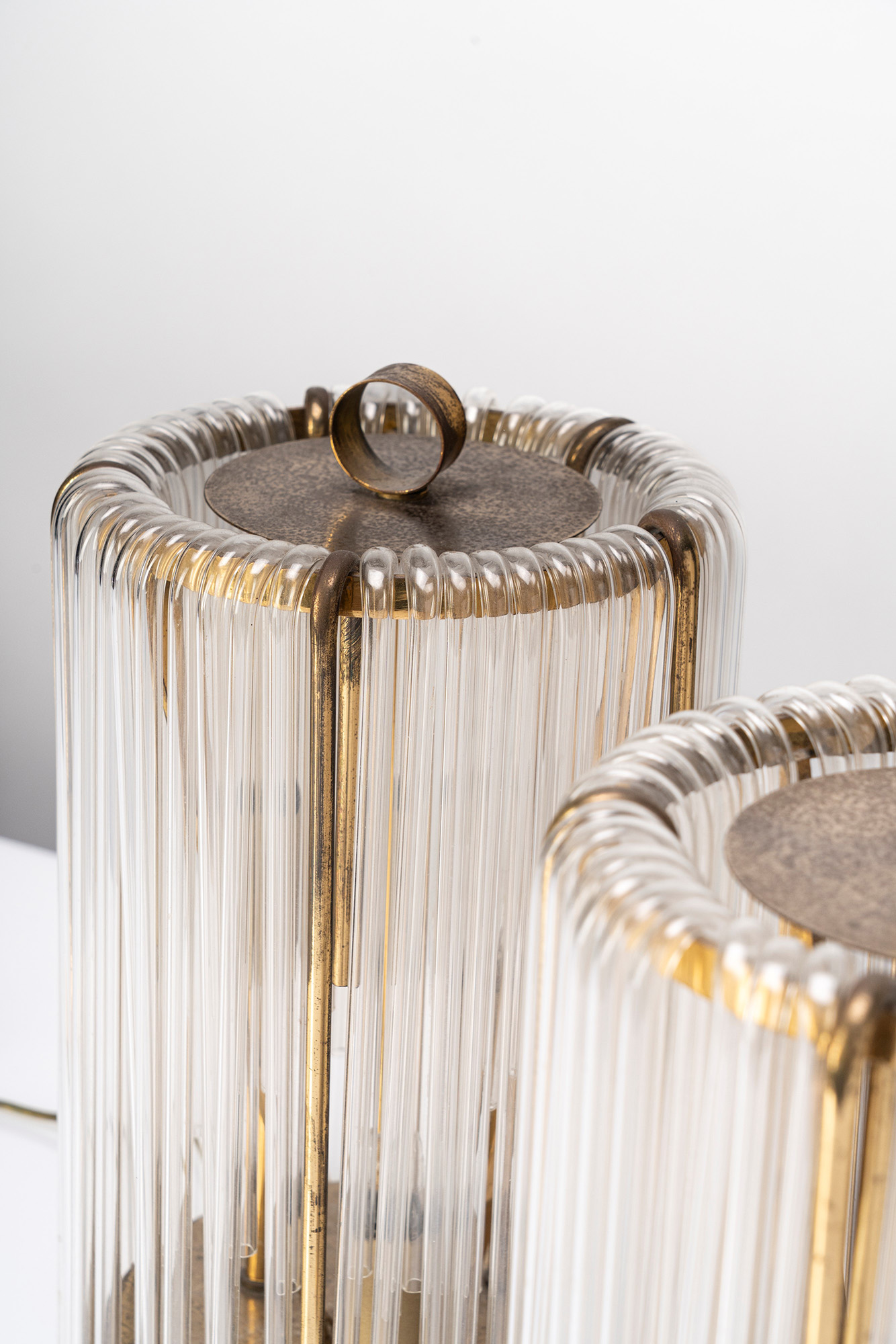 Coppia di lampade da tavolo con struttura in ottone e diffusori a canne in vetro soffiato