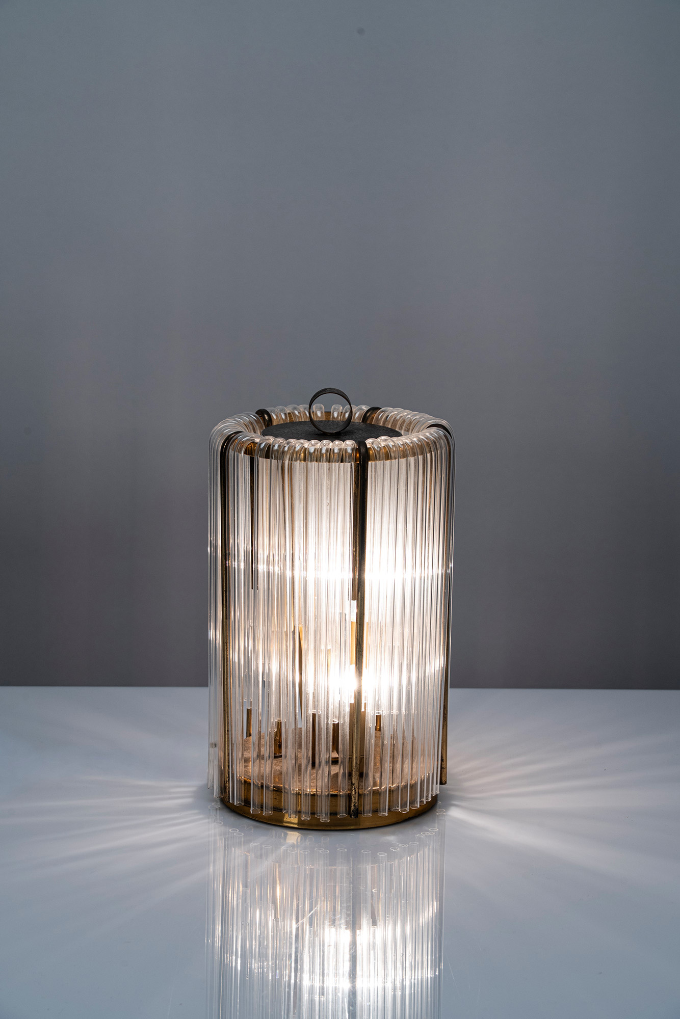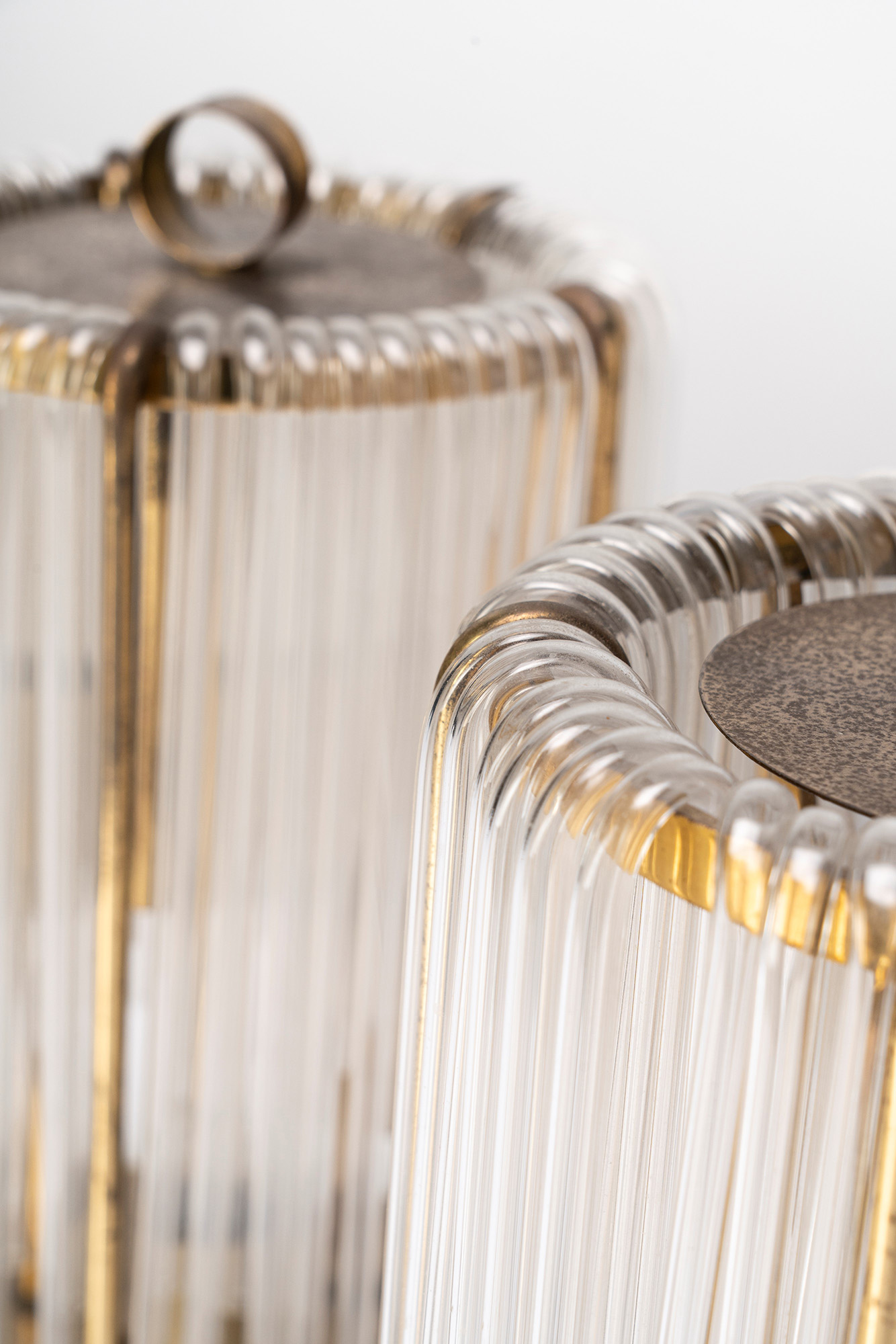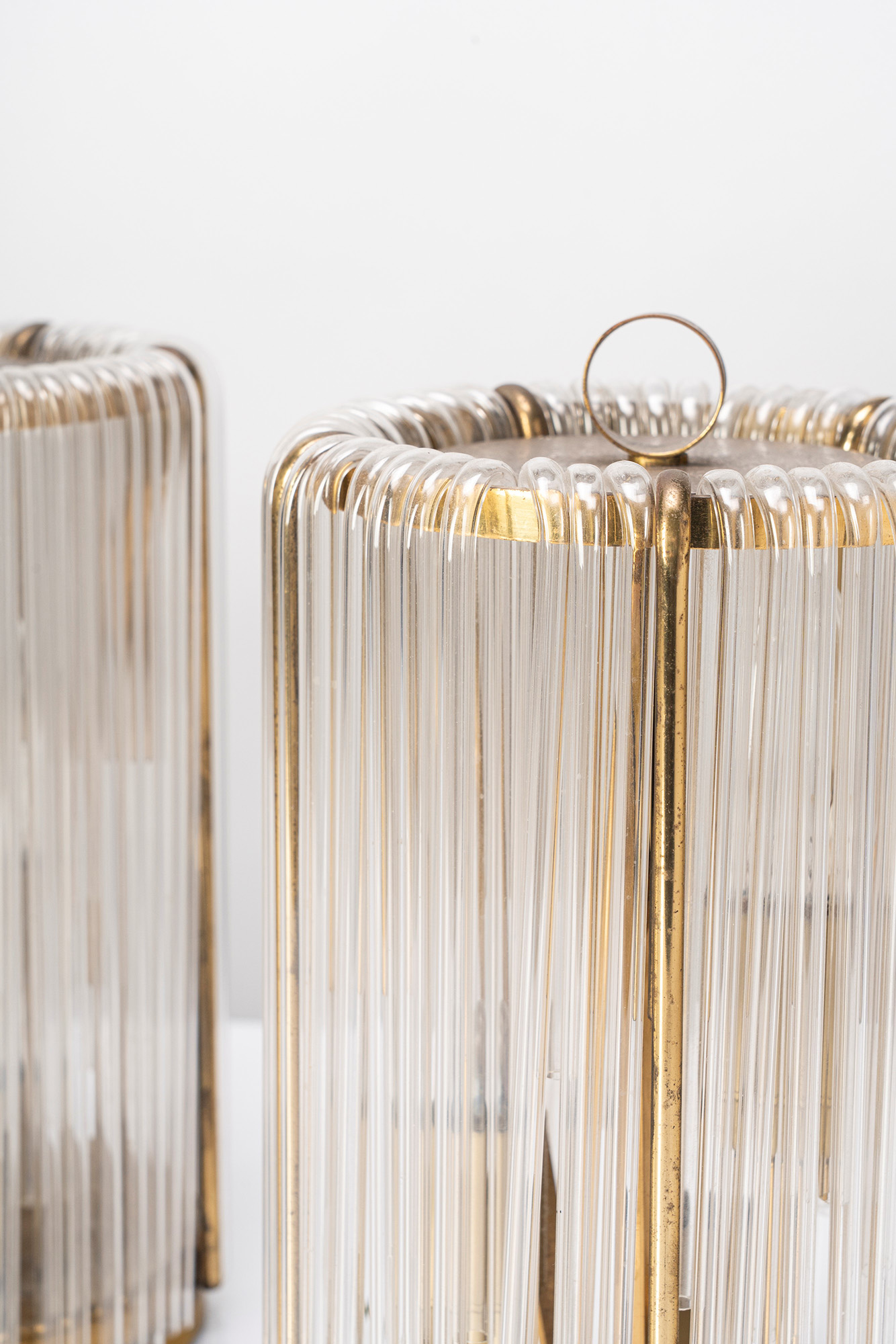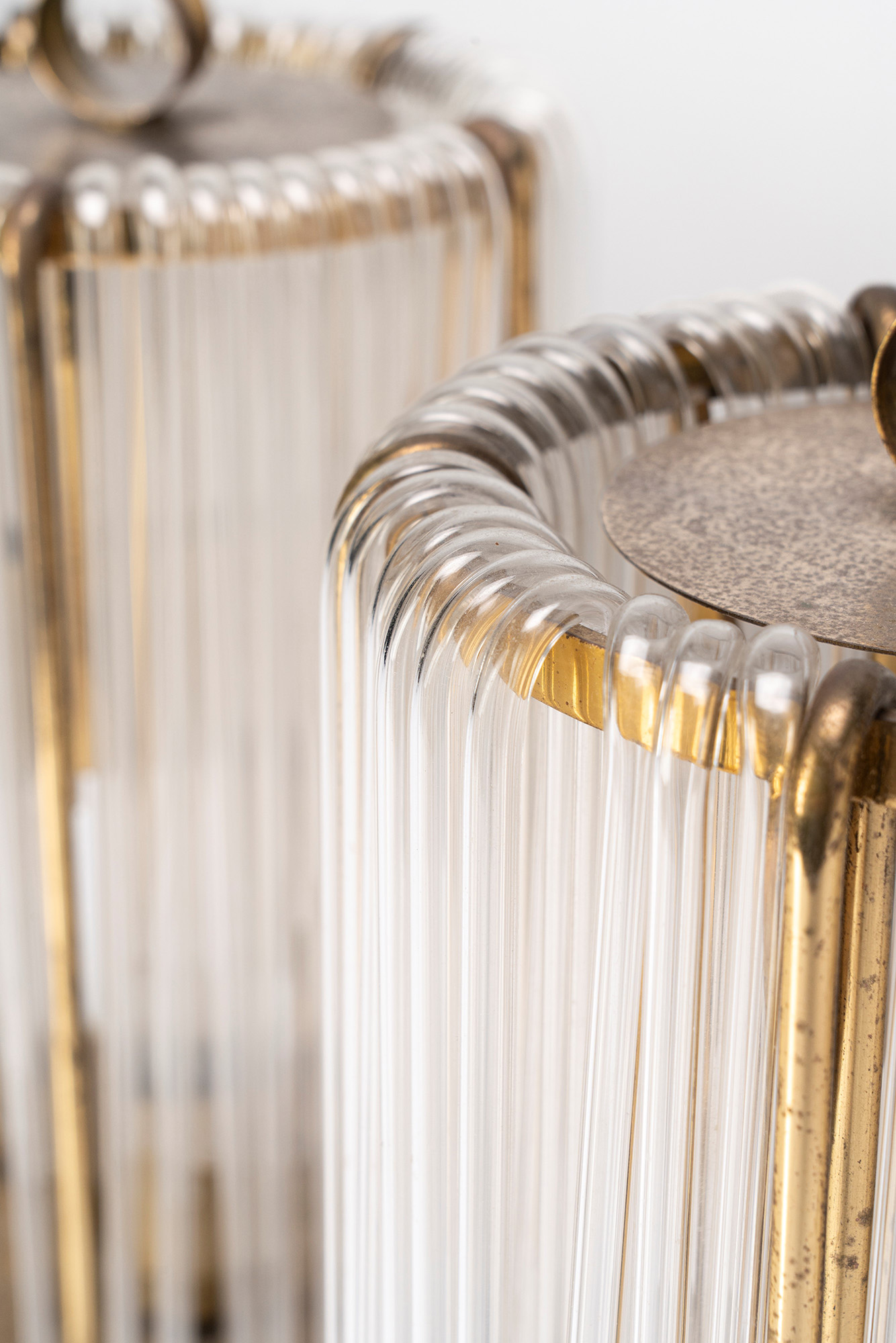 Coppia di lampade da tavolo con struttura in ottone e diffusori a canne in vetro soffiato