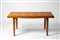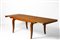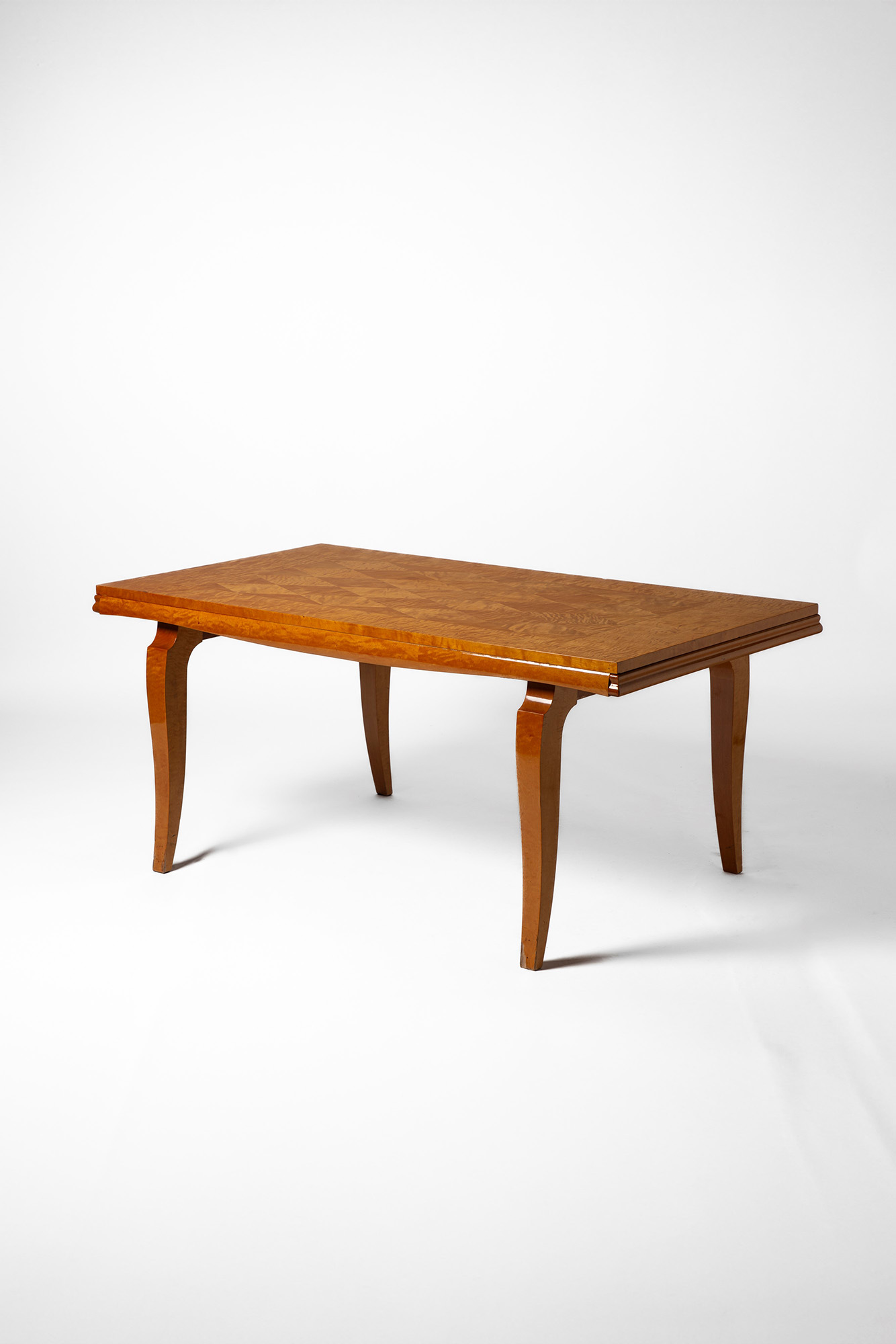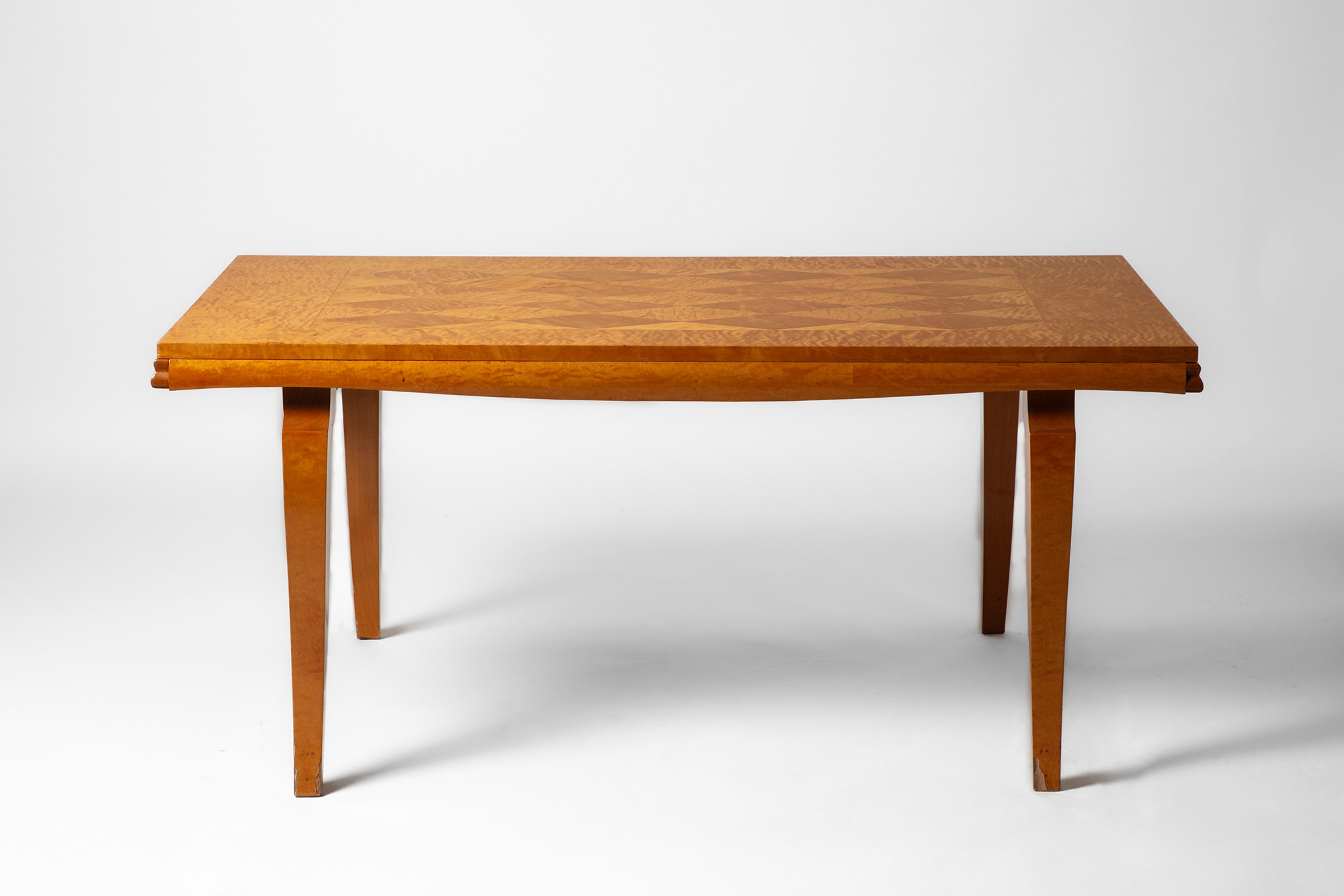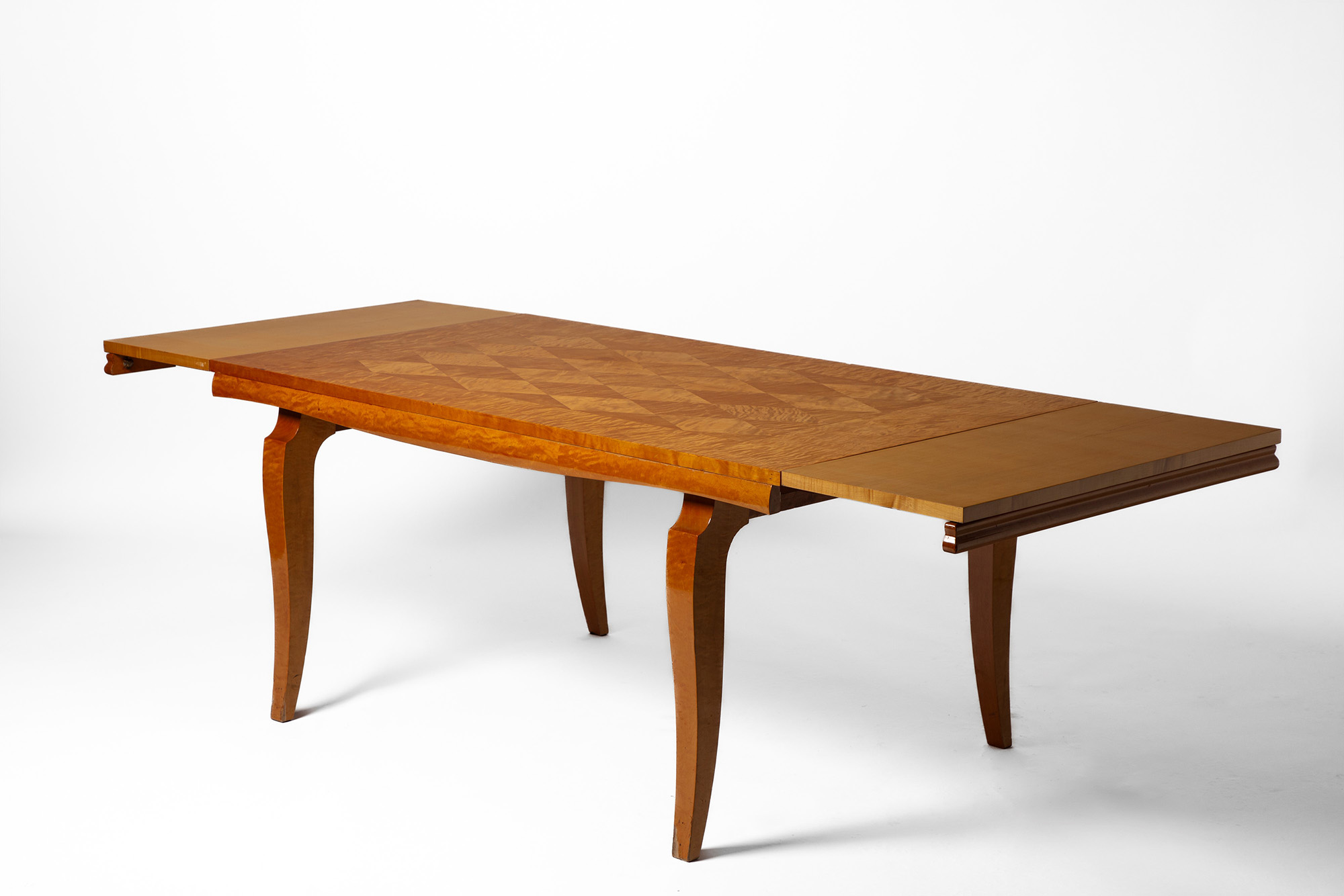 Tavolo da pranzo con prolunghe, legno impiallacciato a disegno geometrico sul piano e gambe sagomate