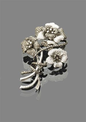 SPILLA Spilla in oro bianco e oro brunito a forma mazzo di fiori con pavè di piccoli diamanti taglio vecchio peso gr 37,00 white and bronzed gold in the shape of a flower bouquet with pavé of antique cut diamonds weight 37,oo gr