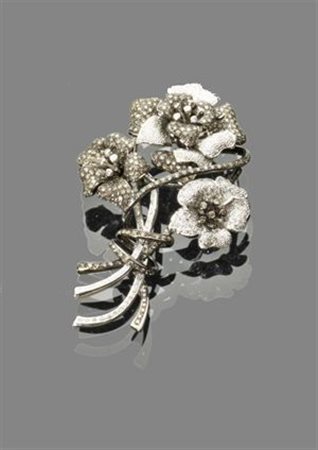 SPILLA Spilla in oro bianco e oro brunito a forma mazzo di fiori con pavè di...