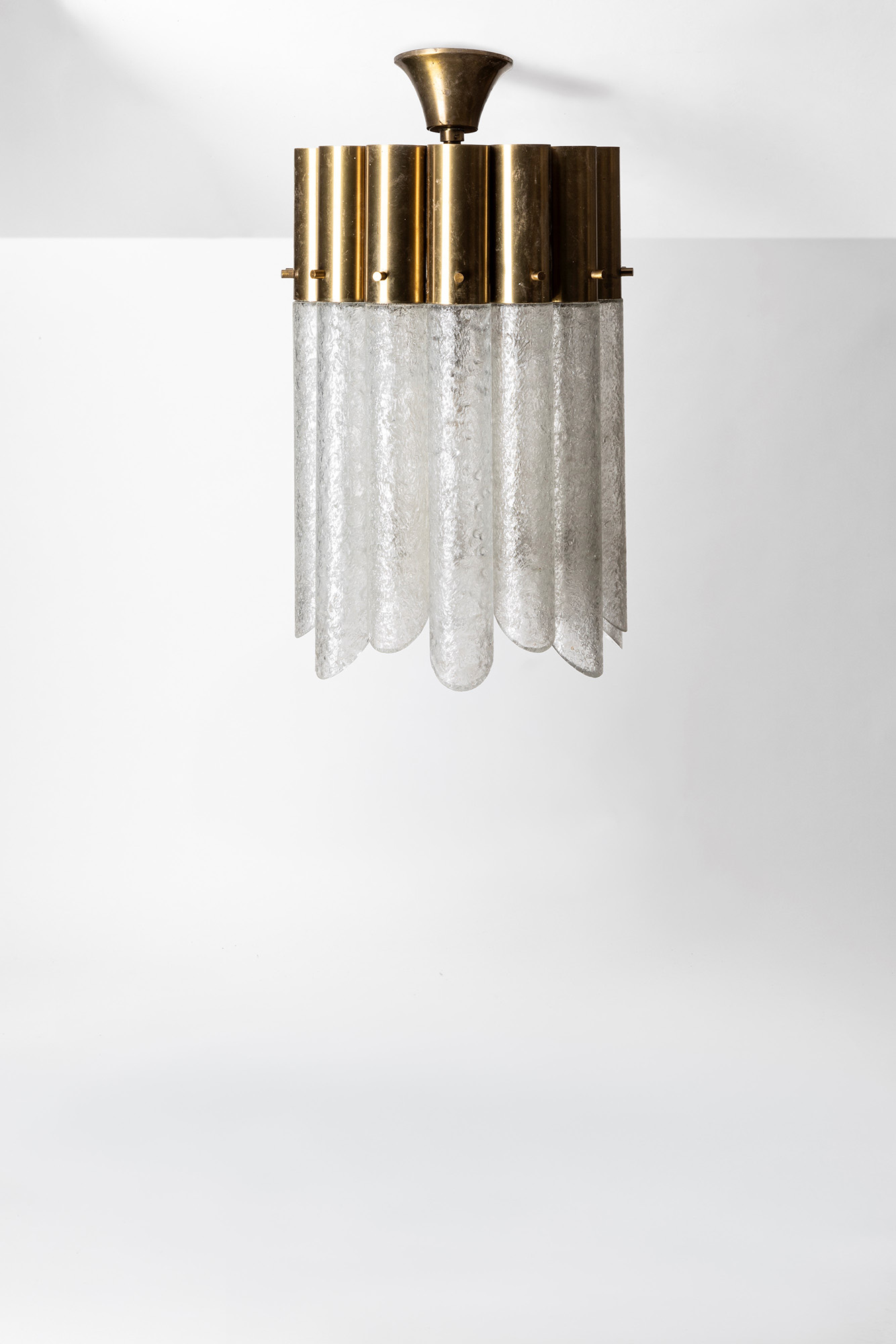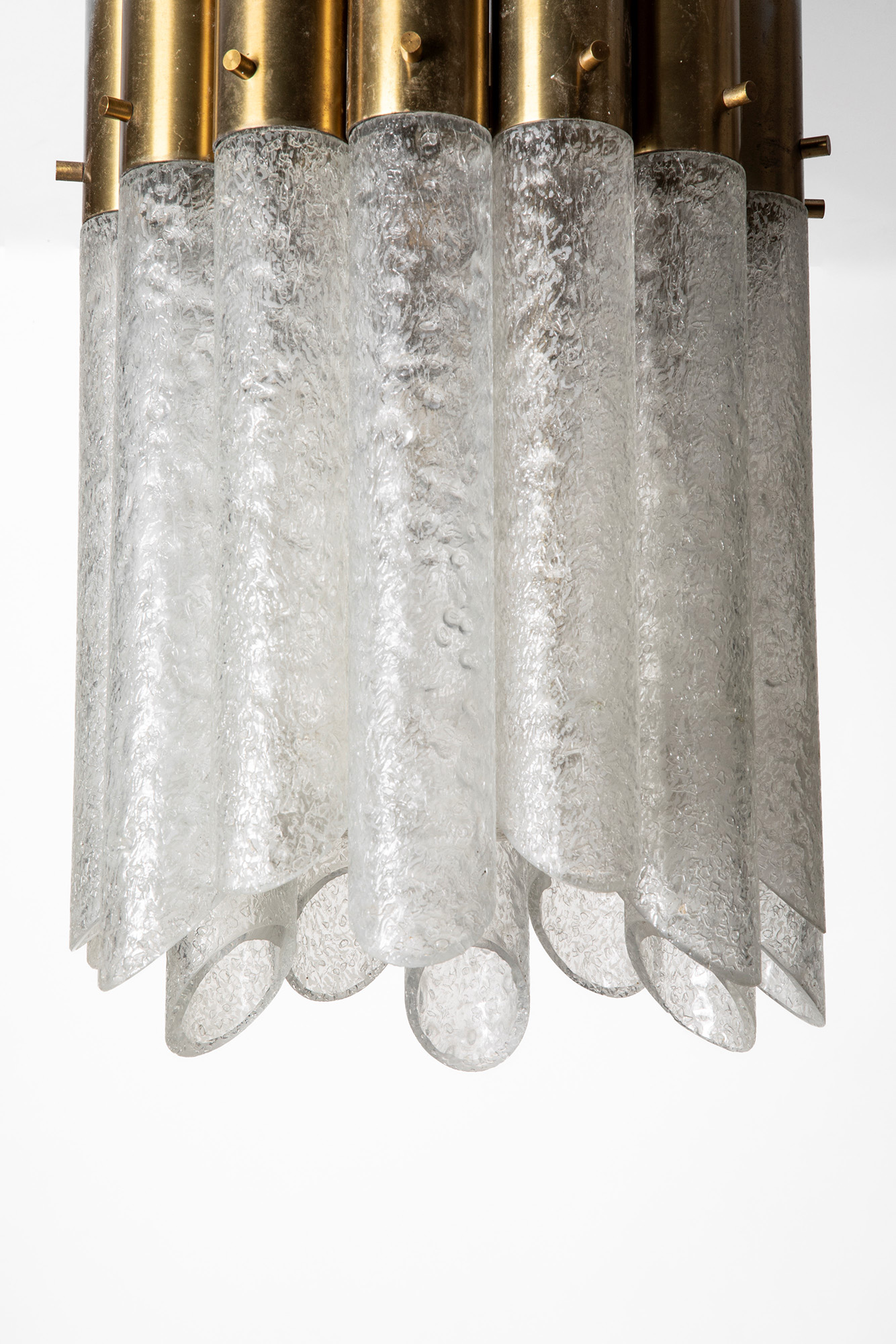 Lampadario con struttura in ottone e diffusori tubolari in vetro