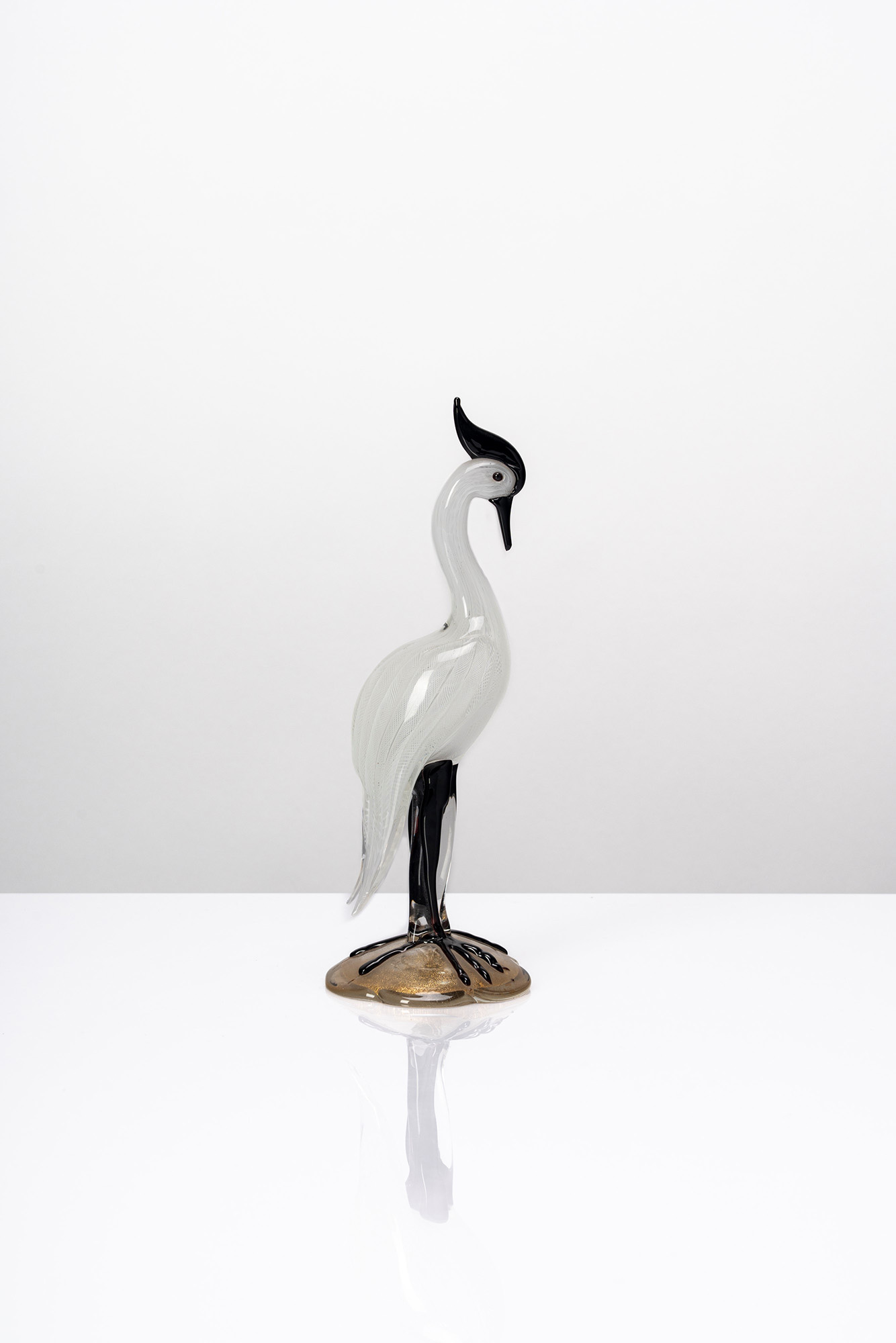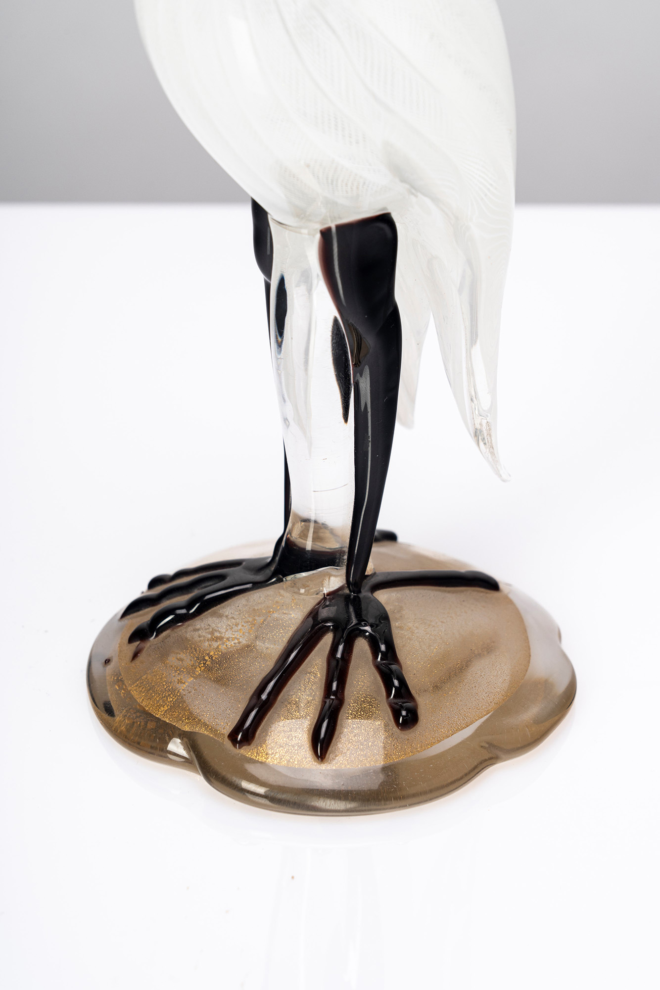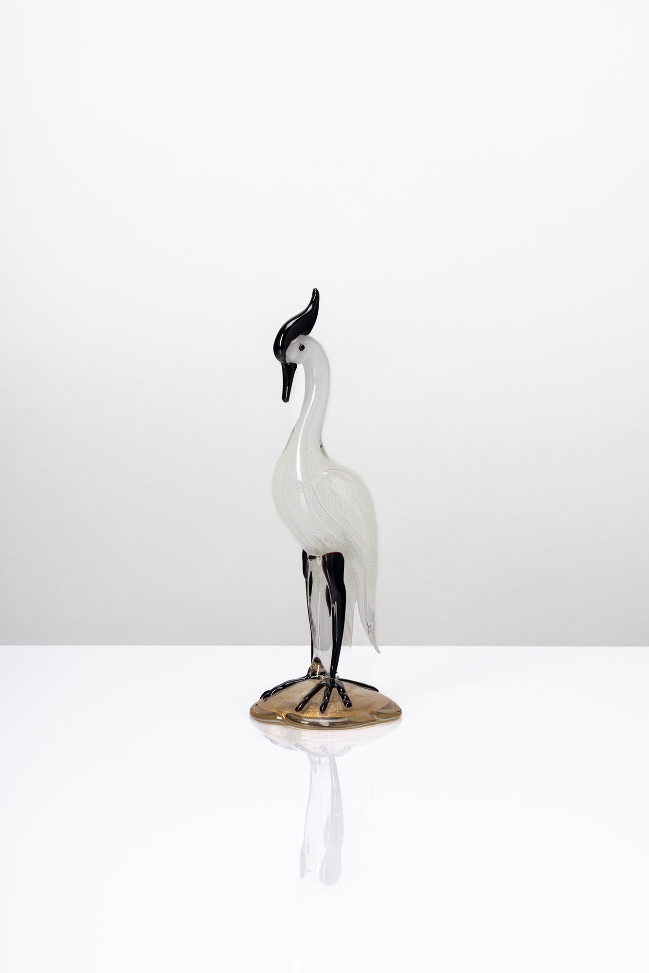 Figura di Airone con corpo in vetro incolore con decorazione zanfirico, dettagli in vetro ametista applicati a caldo e base con decoro a foglia d'oro