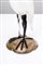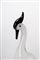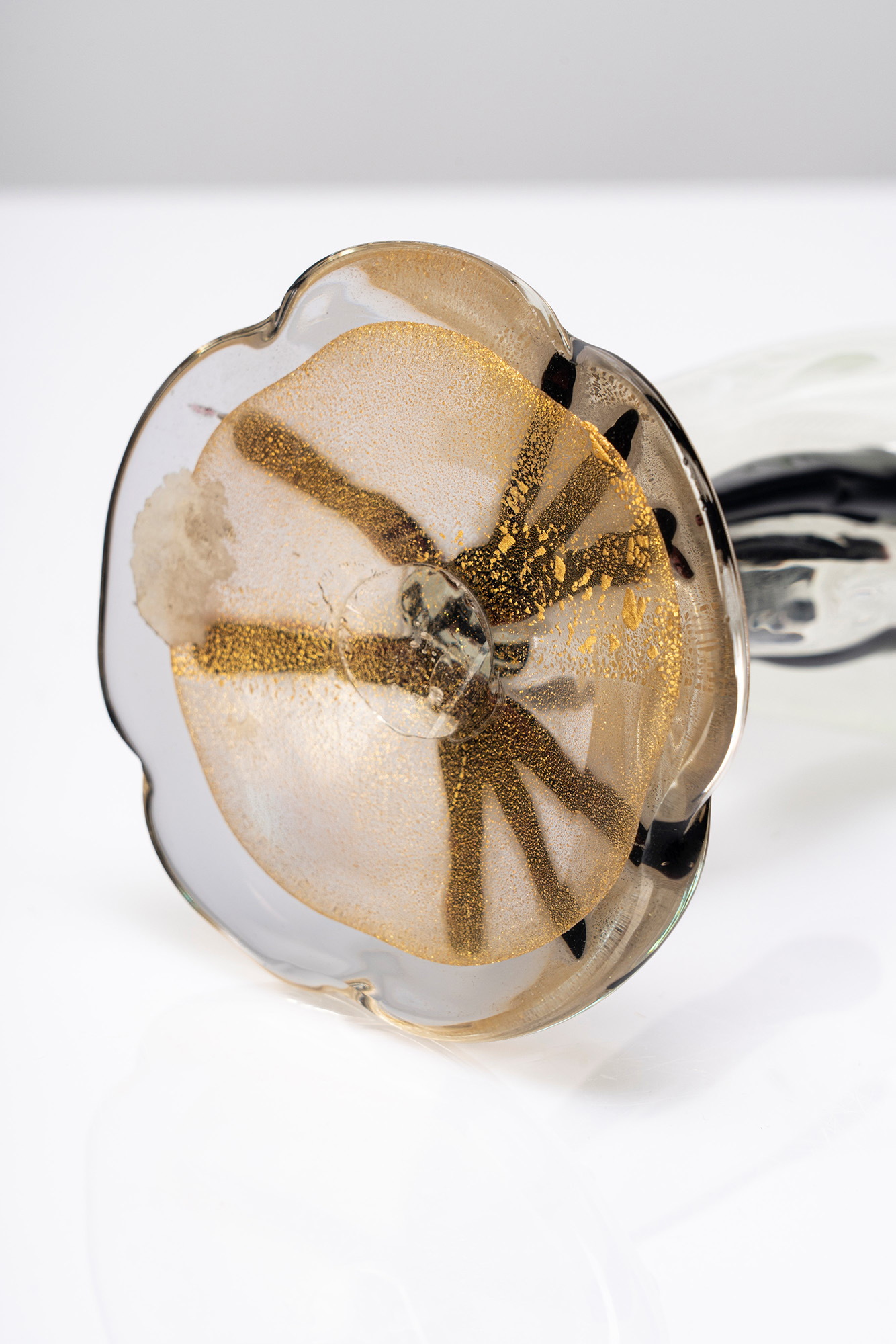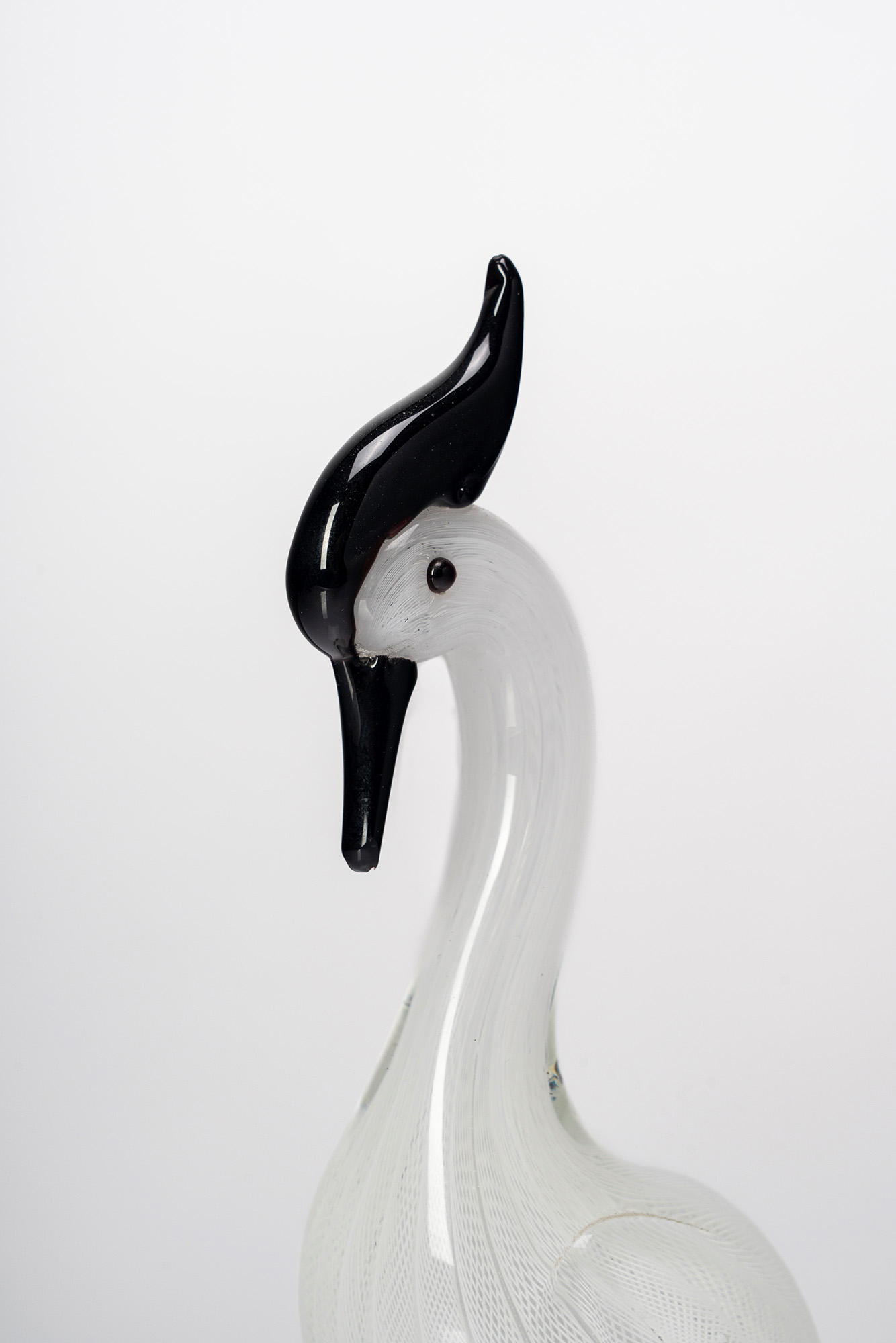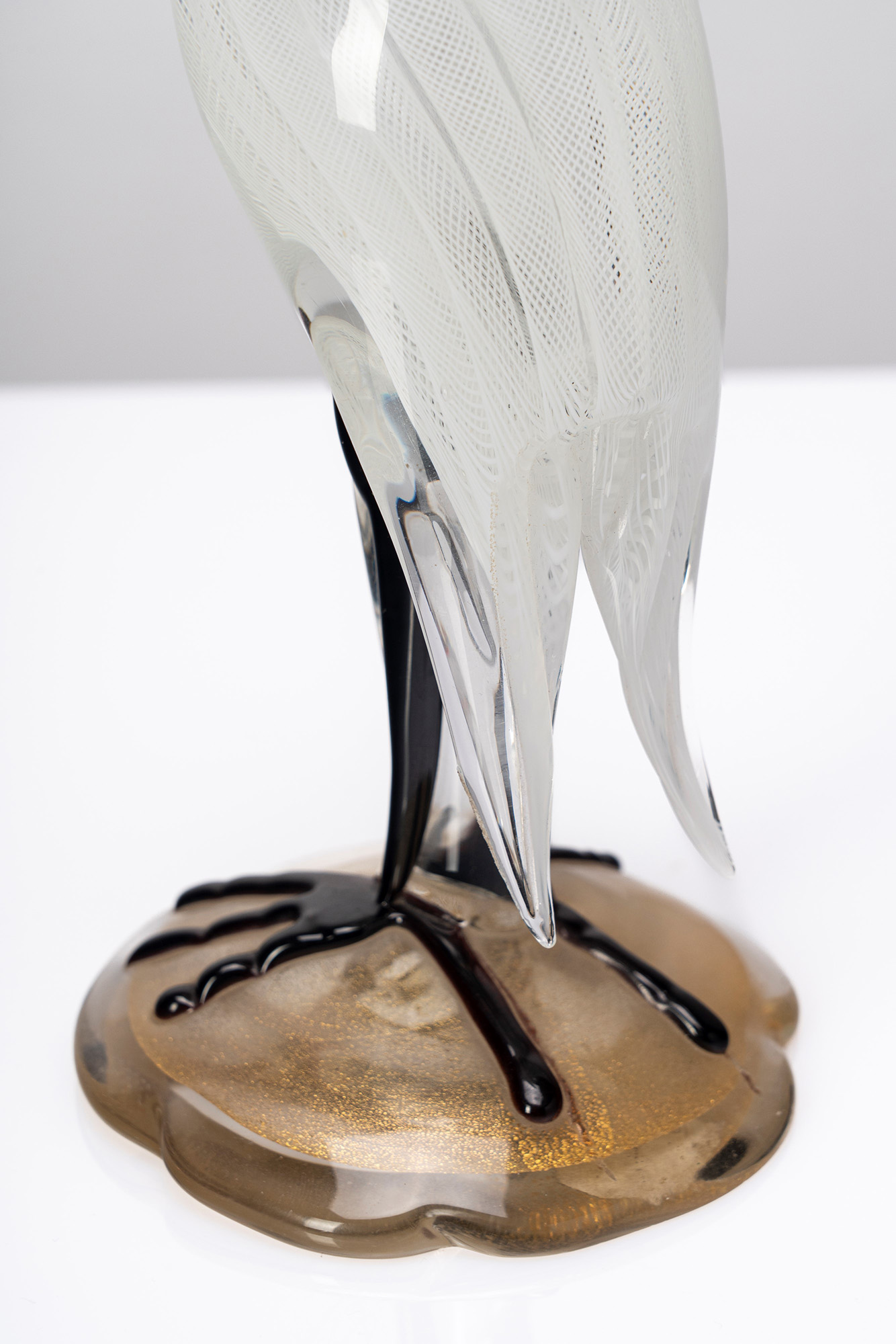 Figura di Airone con corpo in vetro incolore con decorazione zanfirico, dettagli in vetro ametista applicati a caldo e base con decoro a foglia d'oro