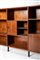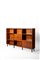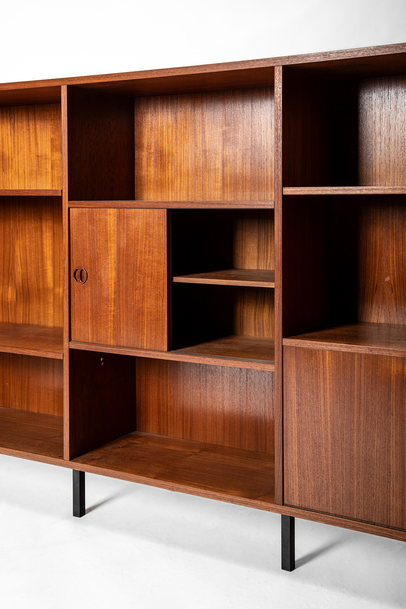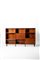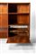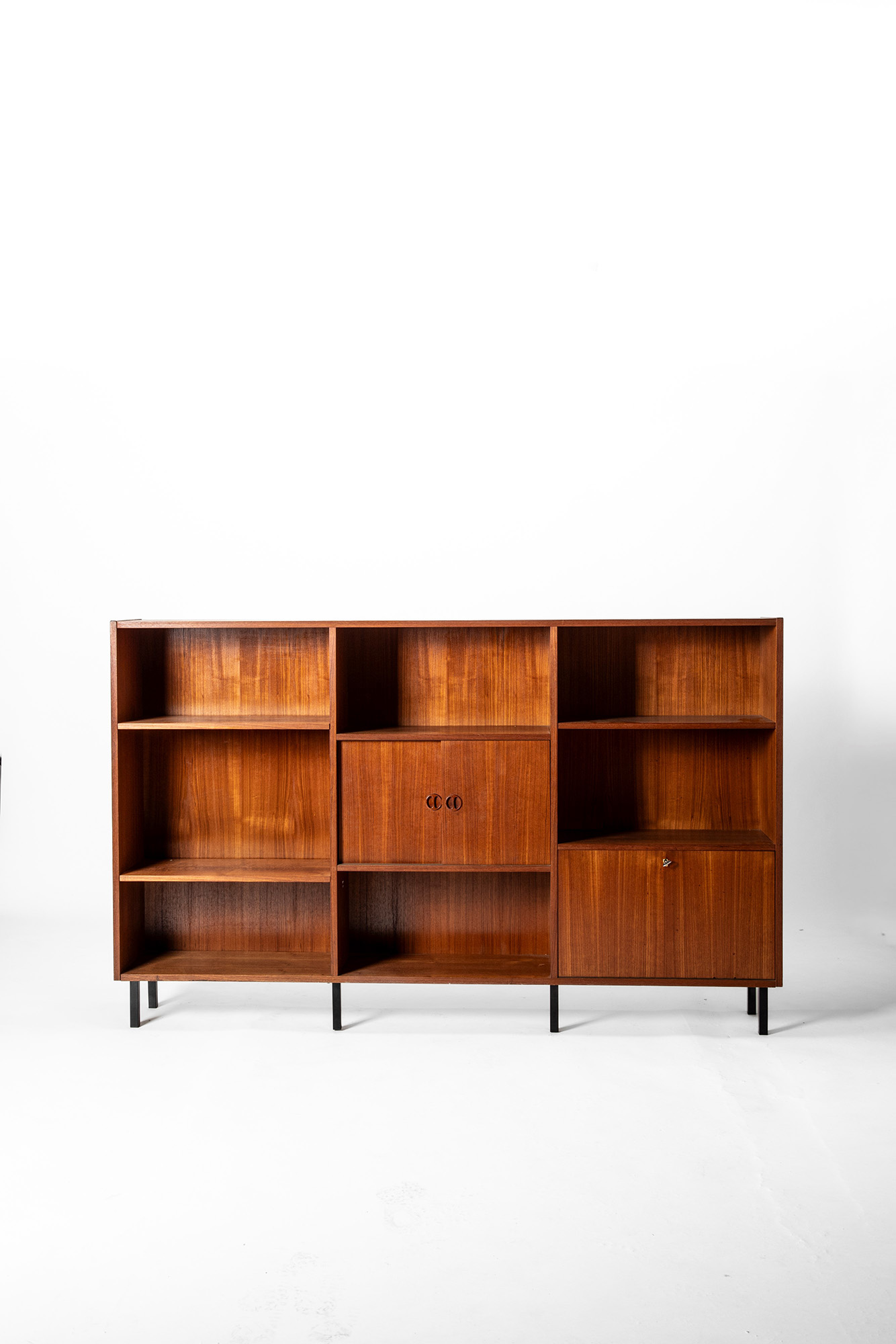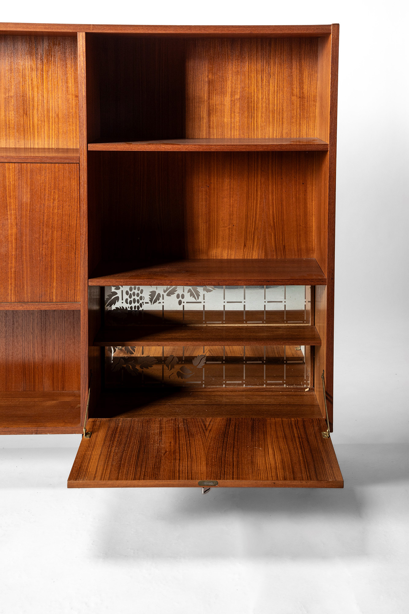 Mobile contenitore con ripiani a vista ed elementi chiusi con ante scorrevoli e bar con anta a ribalta e rivestimenti in vetro specchiato