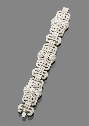 BRACCIALE Bracciale in oro bianco a segmenti geometrici con pavè di diamanti taglio brillante per complessivi ct 7,50 ca. Firmato TIFFANY peso gr 76,50 White gold bracelet with geometric segments pave diamonds totaling 7.50 ct approx. Weight 76.50 g
