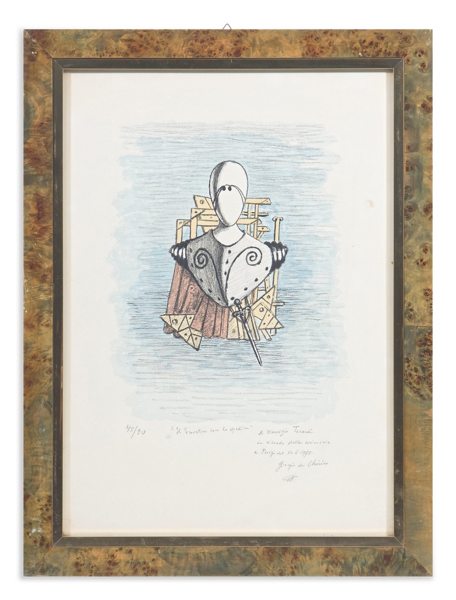 DE CHIRICO GIORGIO (1888 - 1978) IL TROVATORE CON LO SPADINO. 1975. litografia. Cm 35,00 x 49,00. firma, data, titolo, tiratura e dedica ad personam a matita, es. 45/90