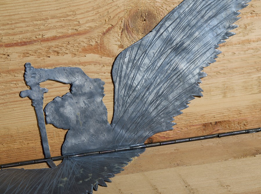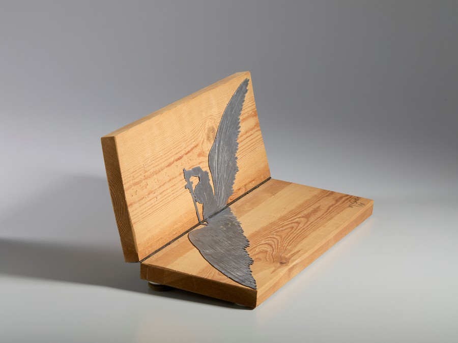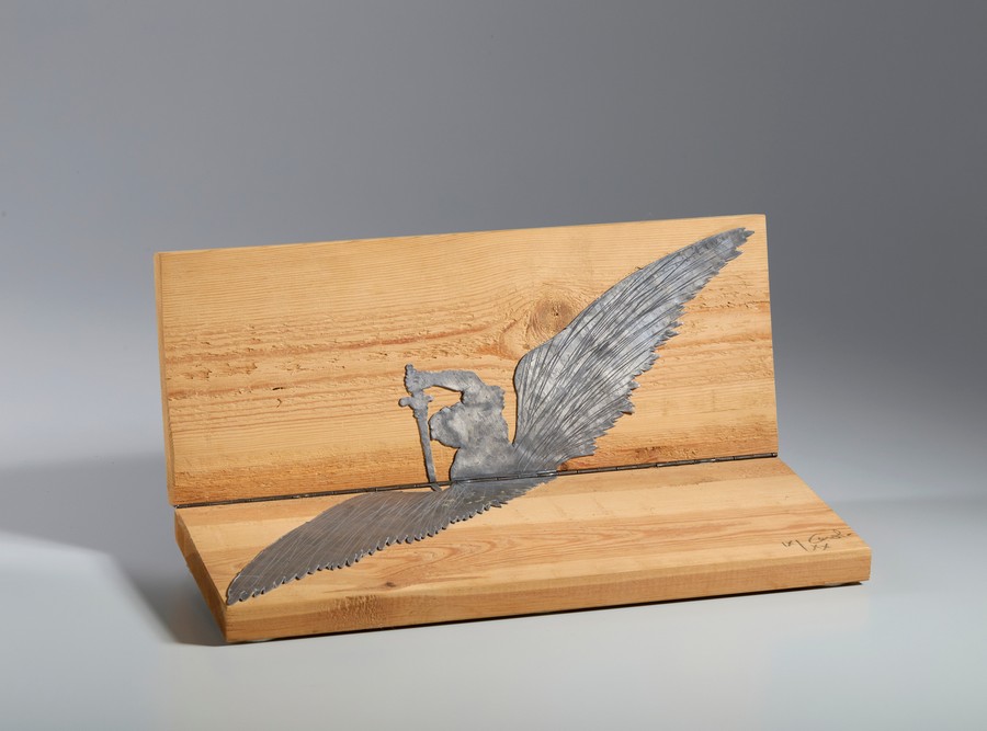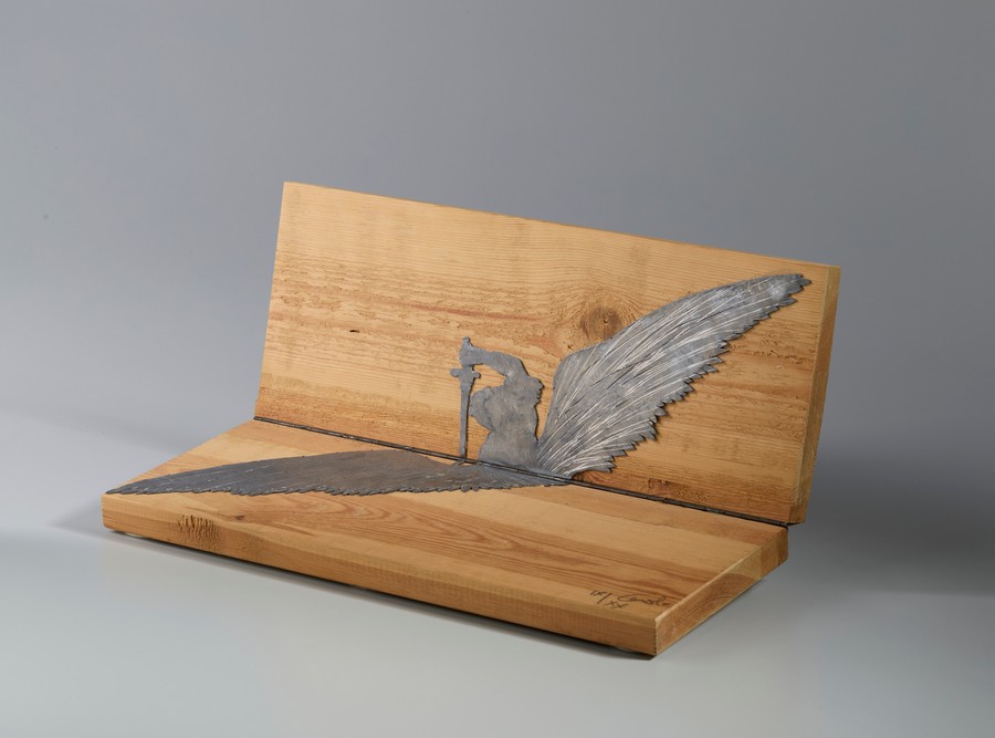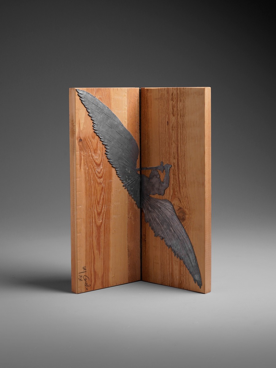 CEROLI MARIO (n. 1938) ANGELO VENDICATORE. 1997. Intaglio a mano da lastra di piombo applicata su legno. Cm 45,00 x 20,00 x 20,00. firma e tiratura a matita, es. IX/XX