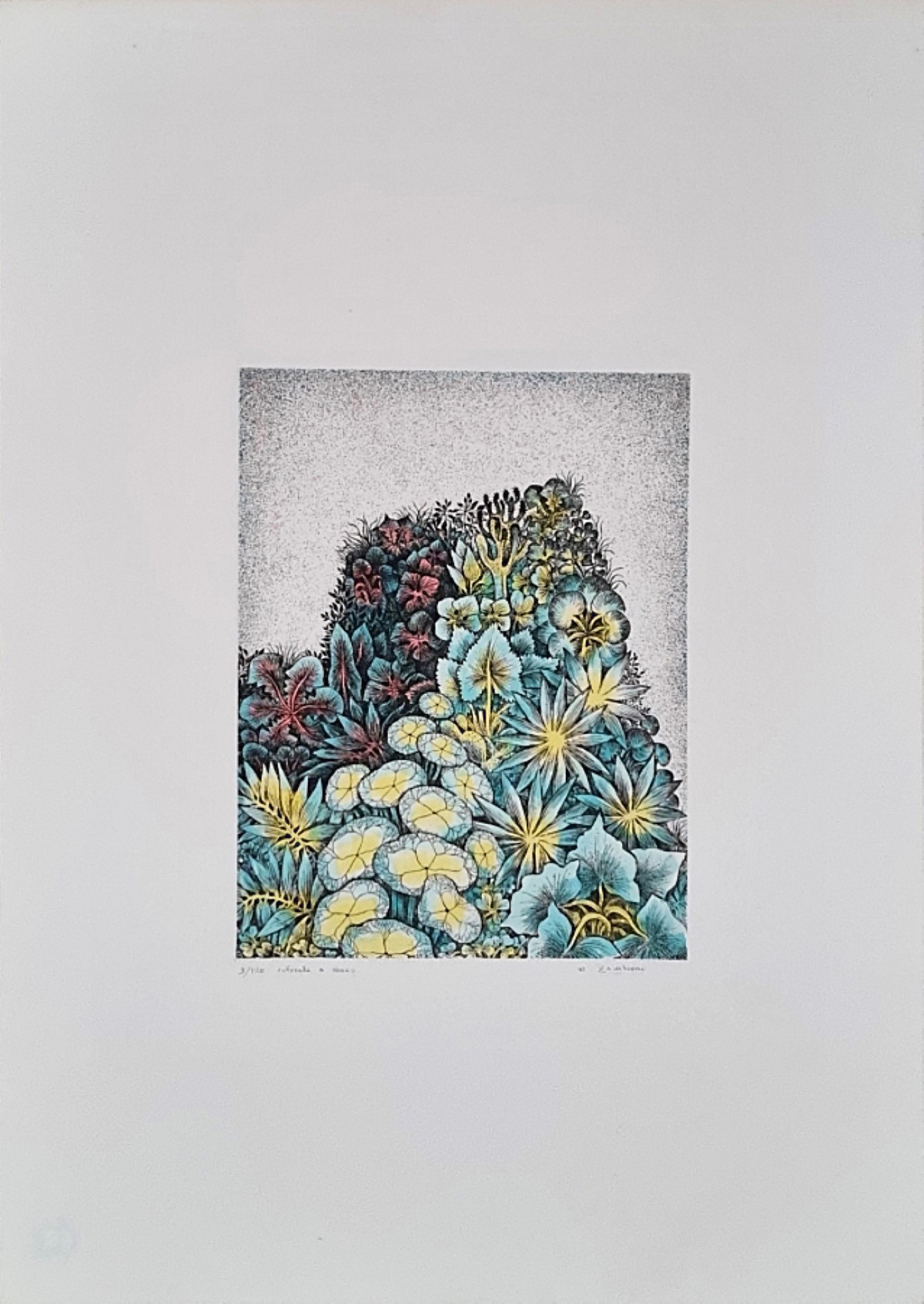 ZAMBONI NICOLA Bologna 1943 - 2023 "Senza titolo" Incisione su cartoncino colorata a mano cm 50x70. Firmata sul fronte in basso a destra, tiratura 9/100 a sinistra. Al verso timbro Edizioni d'Arte il Tetto.