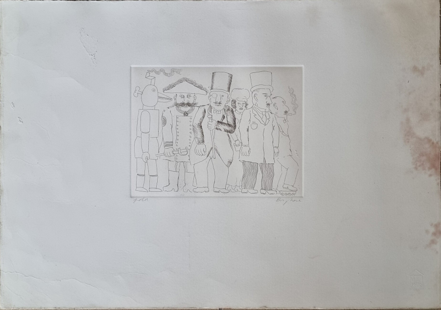 BORGHESE FRANZ Roma 1941 - 2005 "Senza titolo" Incisione su cartoncino cm 50x35 (foglio), cm 19x15 (disegno). Firmata sul fronte in basso a destra, tiratura p.d.a. a sinistra. Provenienza Studio Borghese. (Presenta macchia di umido sul margine destro del foglio).