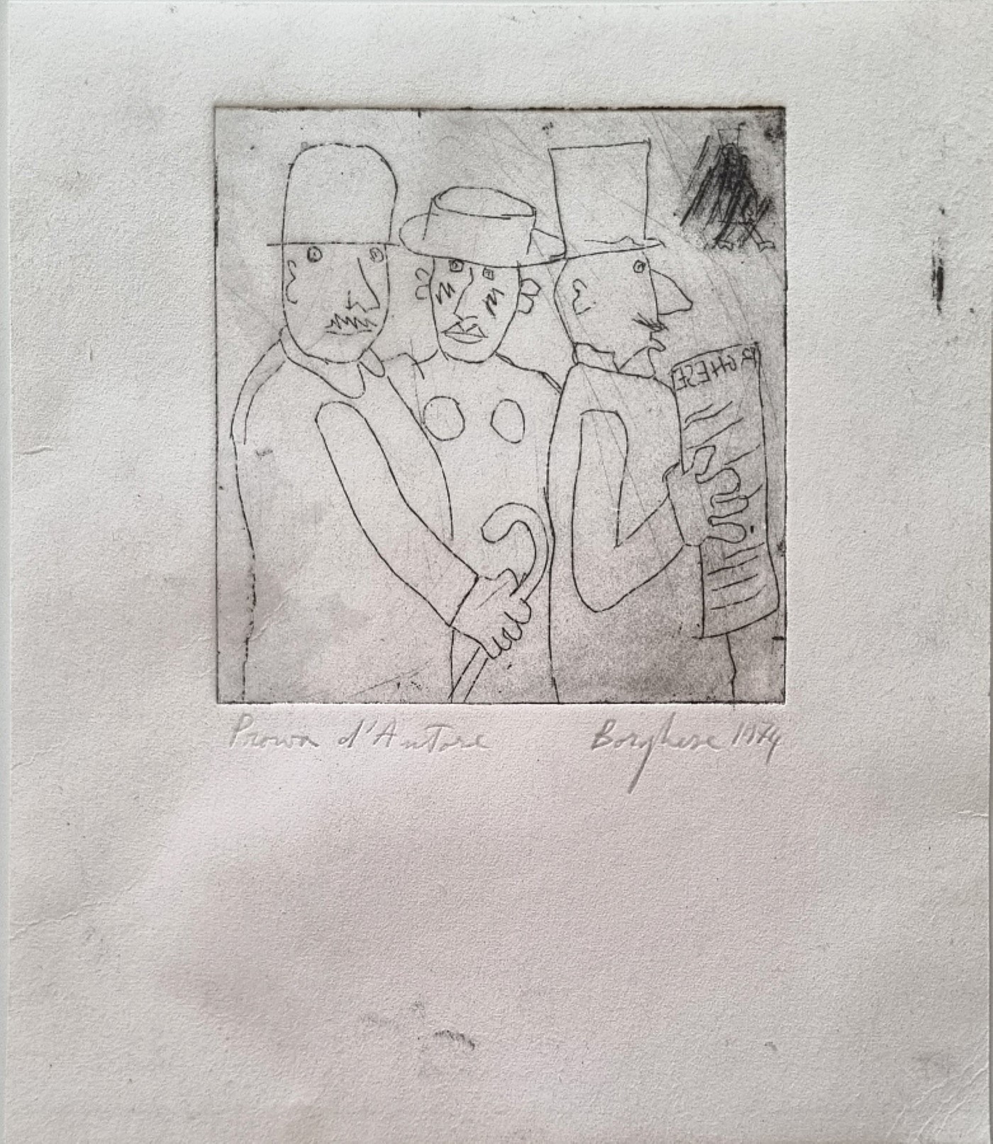 BORGHESE FRANZ Roma 1941 - 2005 "Senza titolo" Incisione su cartoncino cm 16,8x19,5 (foglio), cm 9,7x10 (disegno) del 1974. Firmata e datata sul fronte in basso a destra, tiratura p.d.a. a sinistra. Provenienza Studio Borghese.