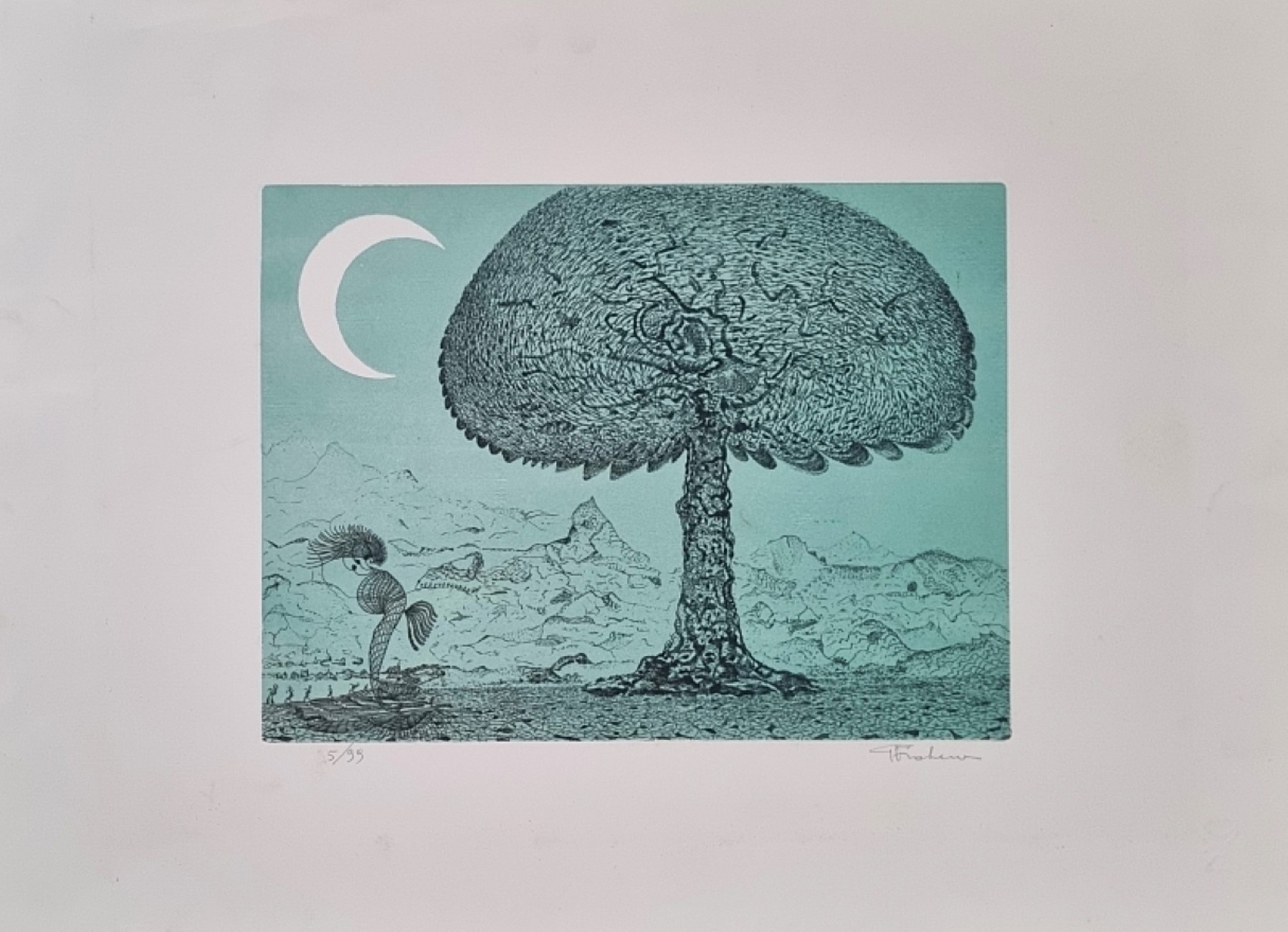 FICHERA GIANNI Catania 1925 "Albero degli elfi" Acquaforte su cartoncino cm 69x50, disegno cm 39,5x29,5. Firmata sul fronte in basso a destra, tiratura 25/99 a sinistra. Certificato di garanzia a cura di Edizioni d'Arte Angolare.