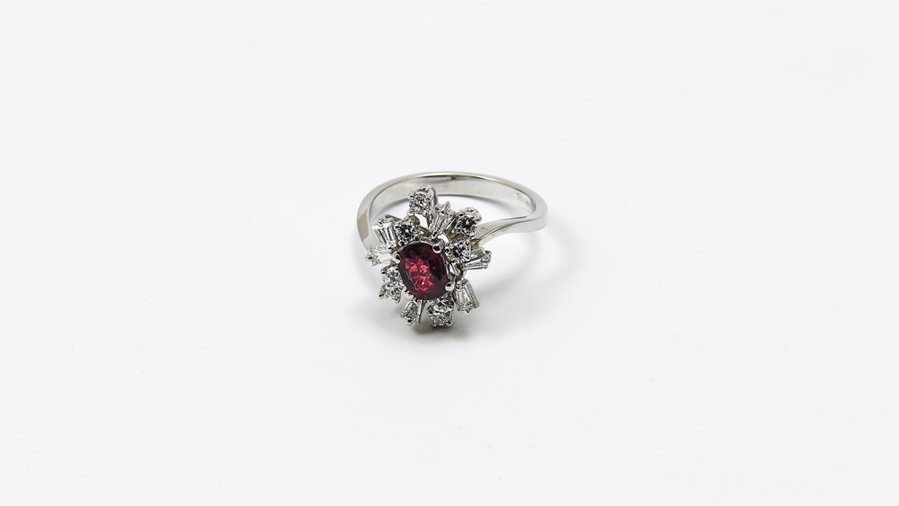 ANELLO IN ORO BIANCO CON CORINDONE VARIANTE RUBINO E DIAMANTI rubino ct 0,90 ca, diamanti taglio a brillante e tape ct 0,50 circa, gr 4,5 RUBY AND DIAMONDS WHITE GOLD RING