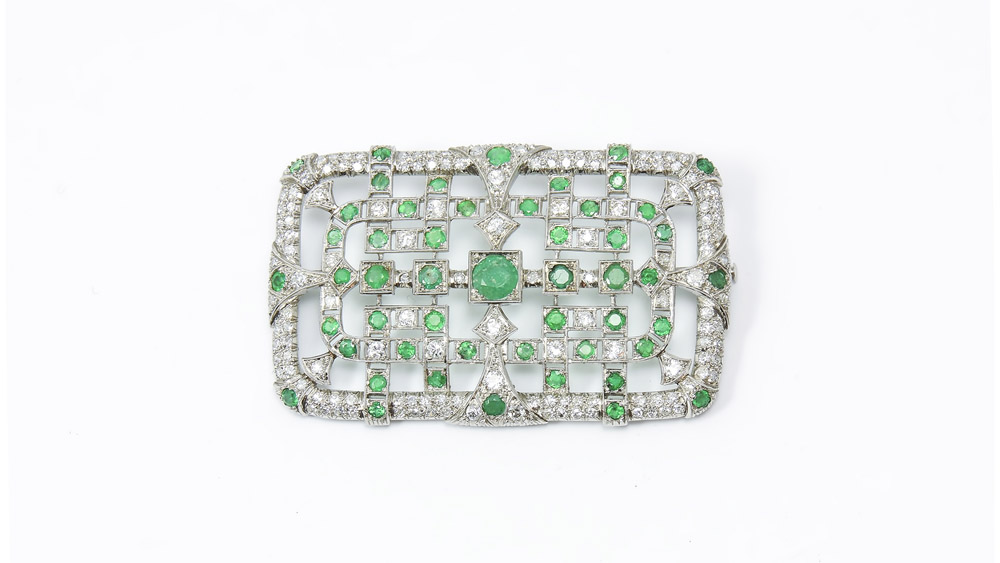Lotto 649 | SPILLA IN PLATINO, DIAMANTI E SMERALDI realizzata come una grande placca...