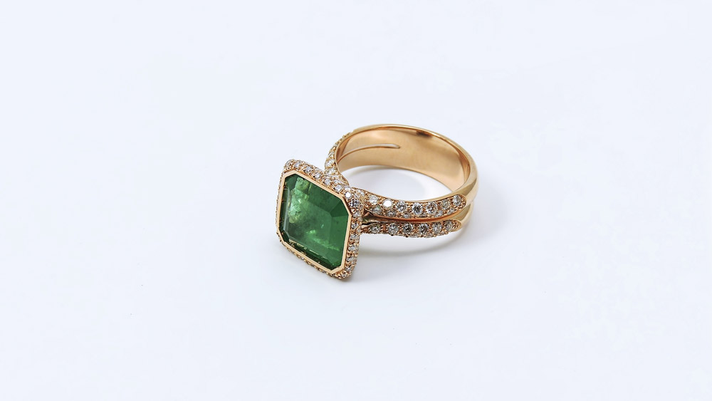 ANELLO IN ORO ROSA, BERILLO VARIANTE SMERALDO E DIAMANTI smeraldo ct 5,50...