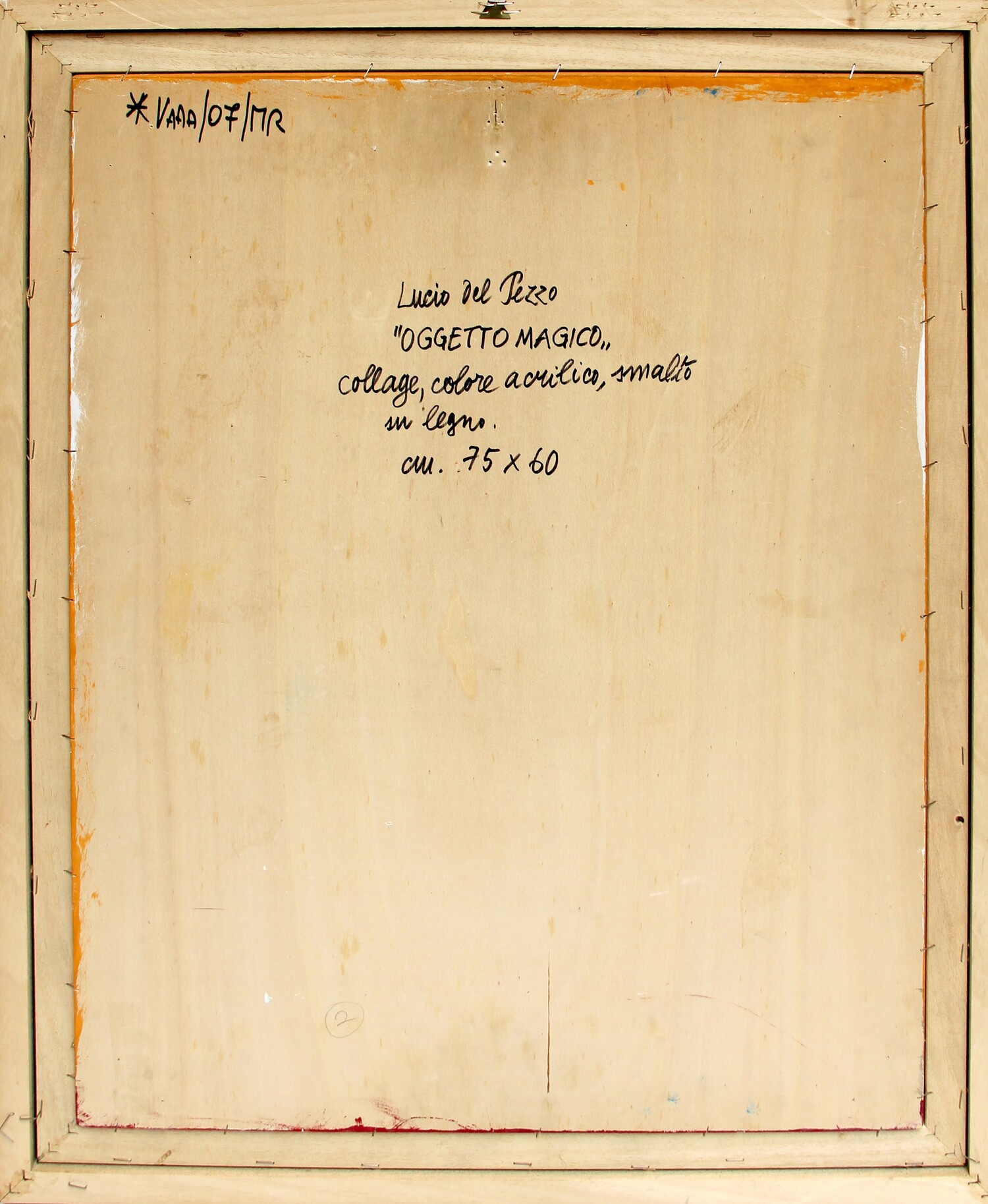 Numerazione, firma, titolo, tecnica, dimensioni "VAAA/07/MR, Lucio del Pezzo, Oggetto magico, collage, colore acrilico, smalto su legno, cm 75x60" (al retro)