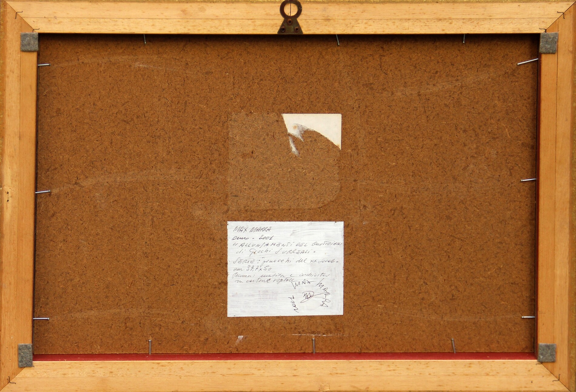Firma, data, titolo, dimensioni, tecnica, firma "Max Marra, anno 2001, Allungamenti del quotidiano di giochi surreali, serie: pinocchi del XX secolo, cm 37,7x50, matita e inchiostri su cartone vegetale, Max Marra" (al retro)