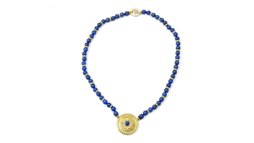 GIROCOLLO IN ORO GIALLO E LAPISLAZZULI Torrini, Firenze centrato da medaglione rotondo cesellato con motivo di sole gr 50,4 GOLD AND LAPIS NECKLACE
