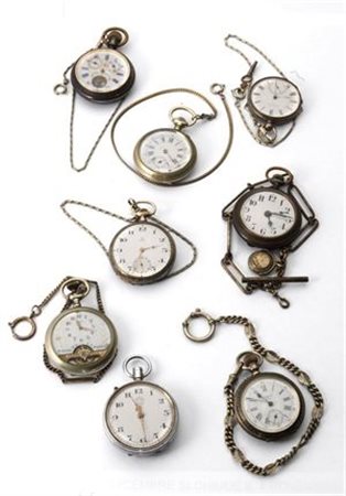 LOTTO DI OROLOGI DA TASCA Composto da otto orologi da tasca di varie epoche, forma, materiale e misura. Alcuni con difetti e da revisionare