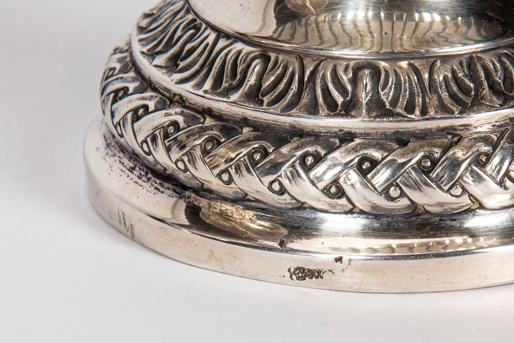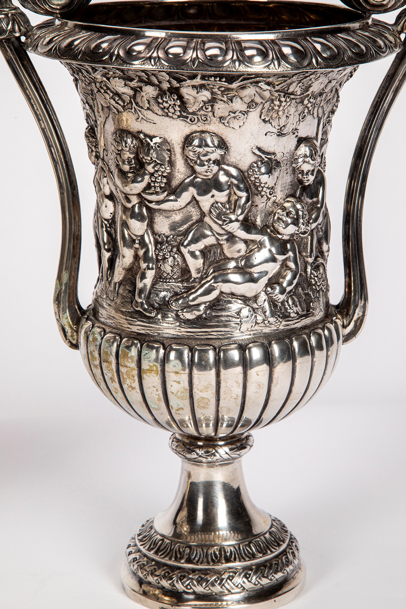 di forma classica con corpo riccamente sbalzato con putti allegorici delle stagioni entro paesaggi, anse mosse terminanti a ricciolo, piede tornito decorato con greche.