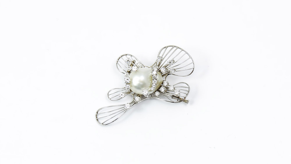 SPILLA IN ORO BIANCO, PERLA SCARAMAZZA E DIAMANTI Torrini, Firenze realizzata come un fiore stilizzato centrato da perla scaramazza ed impreziosito da brillanti ct 2,0 circa, gr 23,9 GOLD, PEARL AND DIAMONDS BROOCH