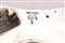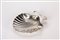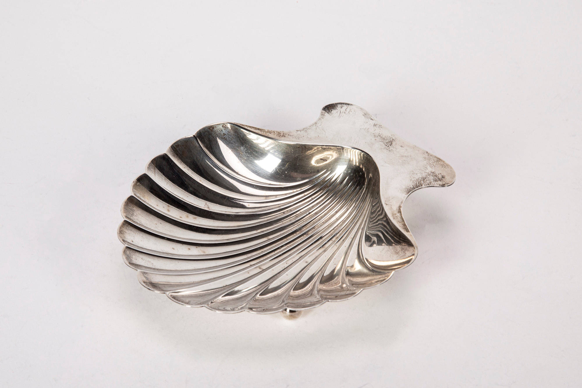 sbalzato a valva di conchiglia, sorretto da due piedini sferici.