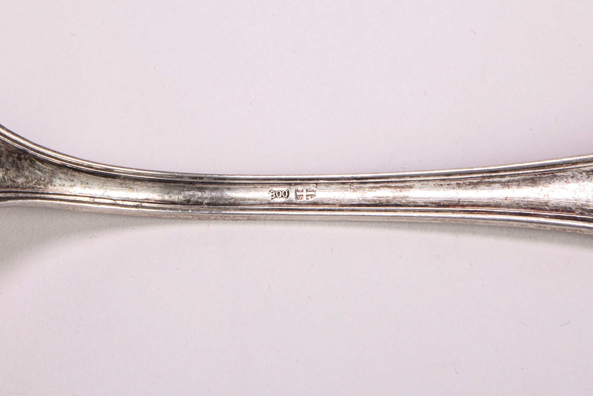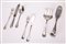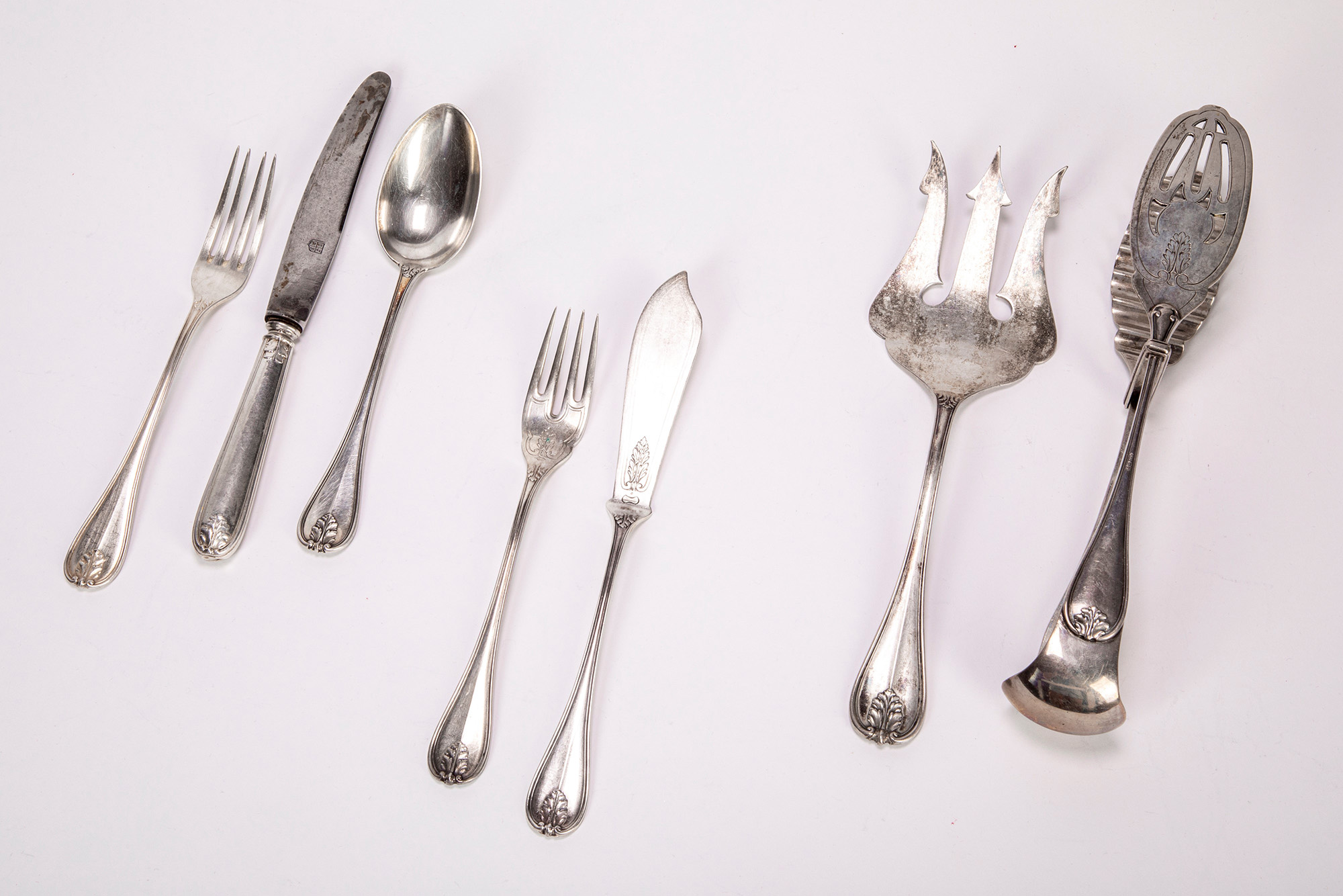 24 forchette, 24 cucchiai, 25 coltelli, 23 forchette da pesce, 25 coltelli da pesce, 1 pinza da pane, 2 forchette da servizio, con prese decorate da piccola foglia in rilievo, leggere scanalature e alcune posate con decori incisi.