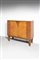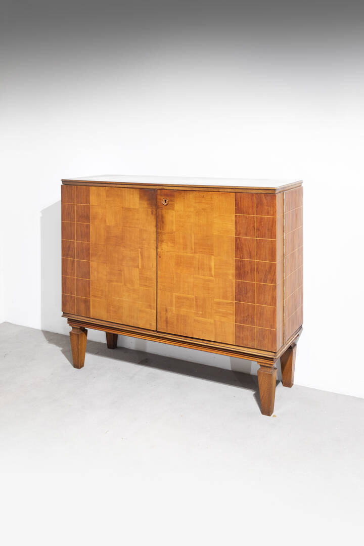 Struttura in legni di varie essenze, interno con ripiani in vetro e particolari in vetro specchiato.