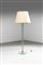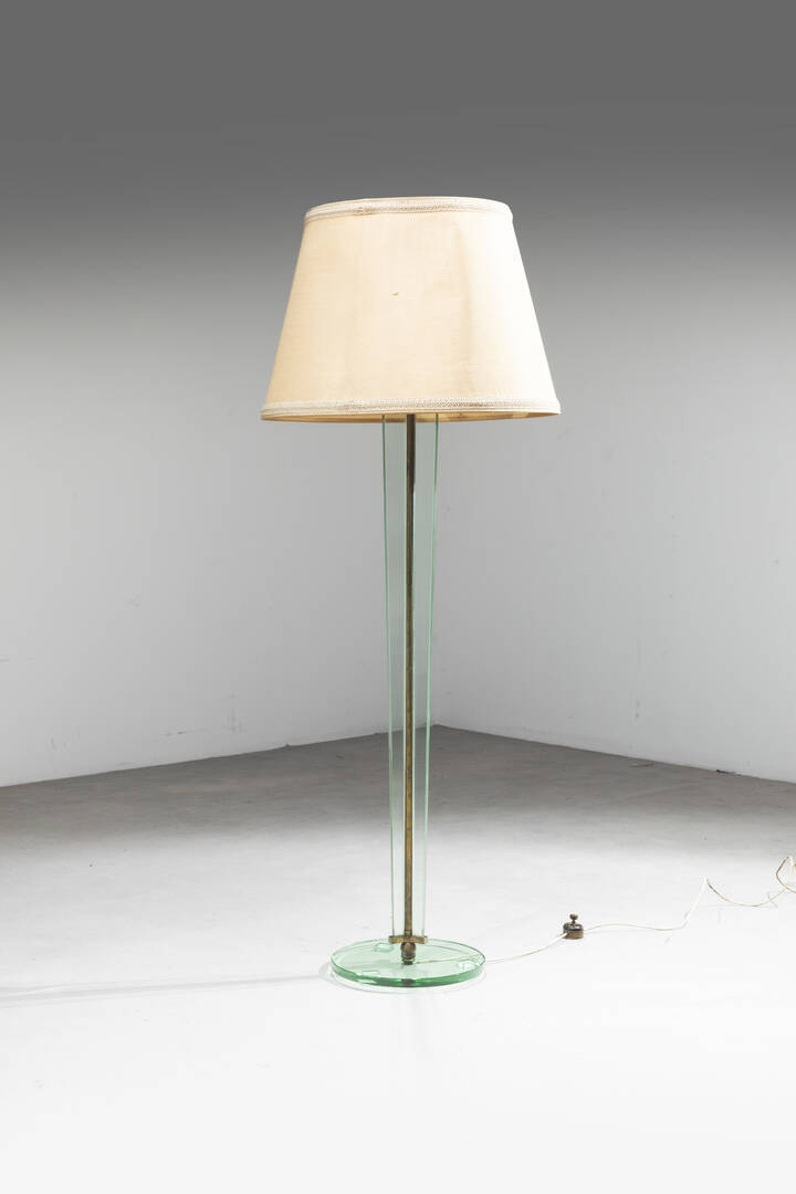 Struttura in ottone e vetro, alluminio verniciato, paralume in tessuto.