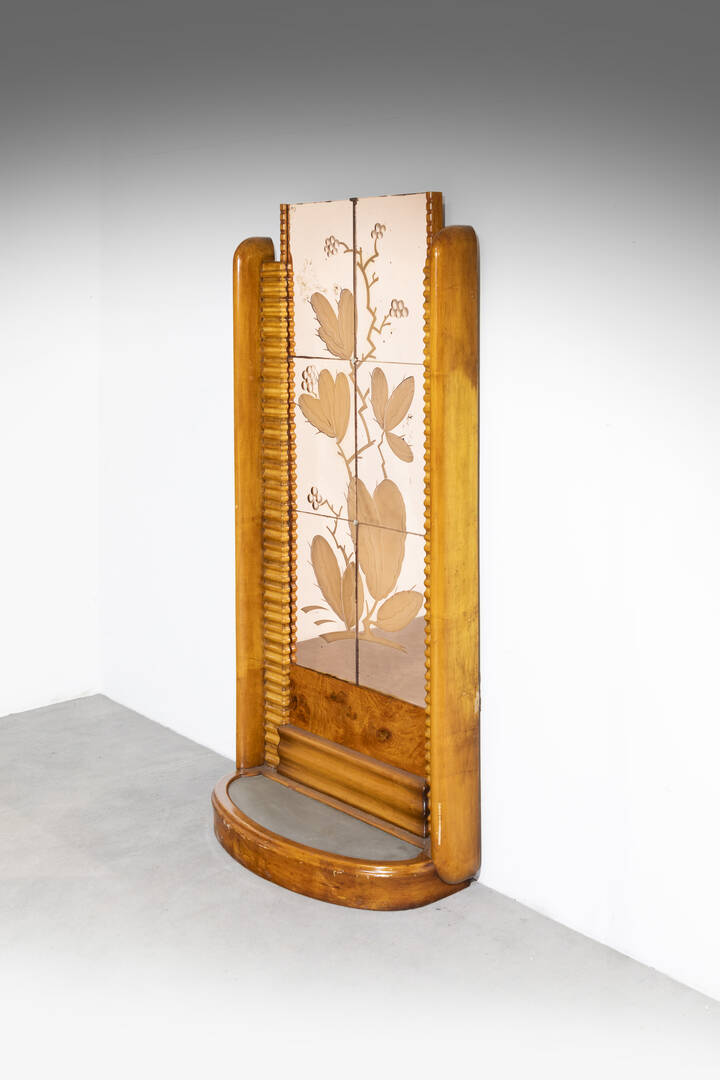 Struttura in legno, vetro specchiato colorato.