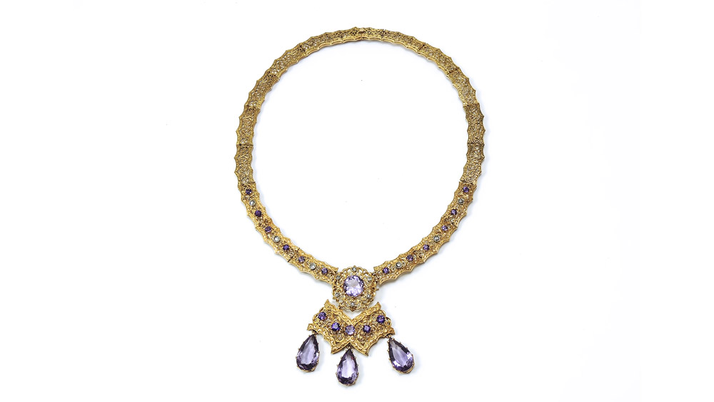 COLLIER IN ORO GIALLO E QUARZI AMETISTA realizzato a placchette sagomante finemente cesellate e traforate in stile fiorentino, impreziosite da rose di diamante alternate, al centro grande pendente smontabile ed utilizzabile come spilla, centrato da ametista rotonda e tre pendenti a goccia, entro scatola A.Caracciolo Livorno - La Spezia gr 64,2 GOLD AND AMETHIST COLLIER