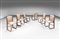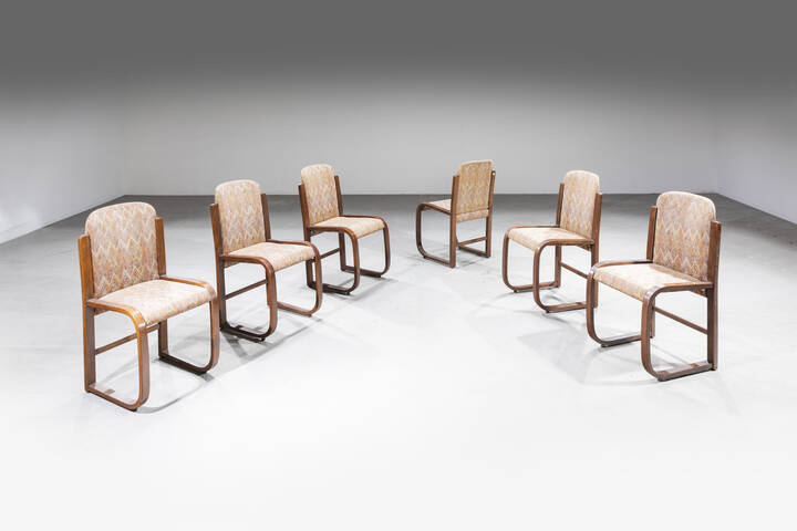 Sei sedie con struttura in legno curvato e imbottitura rivestita in tessuto.