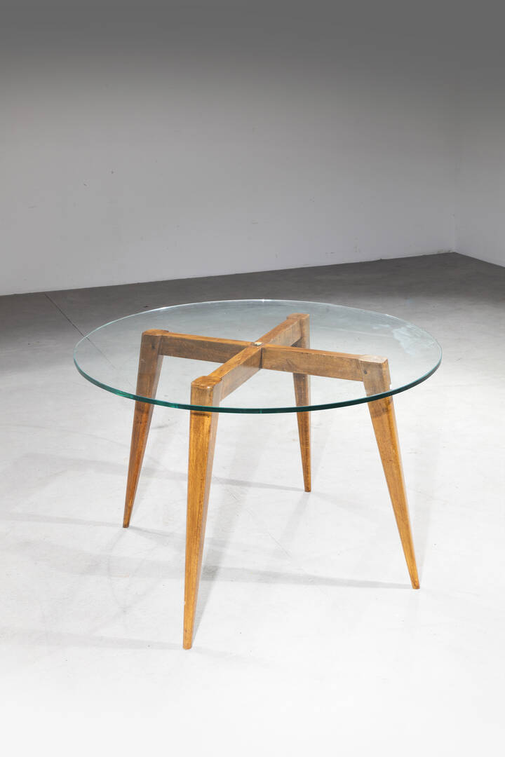 Struttura in legno, piano in vetro e particolari in ottone.