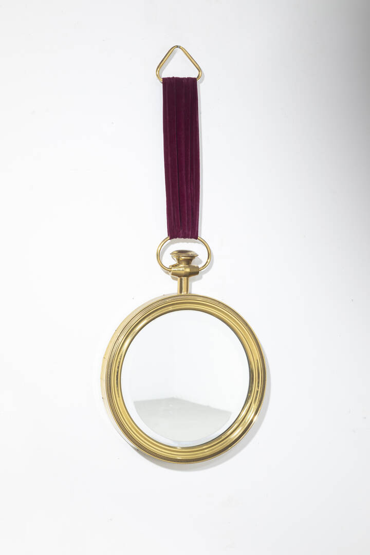 Struttura in ottone, vetro specchiato e particolare in tessuto.