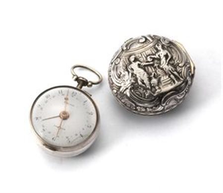 OROLOGIO DA TASCA Oignon in argento con controcassa cesellata e sbalzata, Inghilterra metà XVIII secolo Diam 50 mm Quadrante firmato A. Klein London Oignon silver casing with engraved and embossed, London mid-eighteenth century