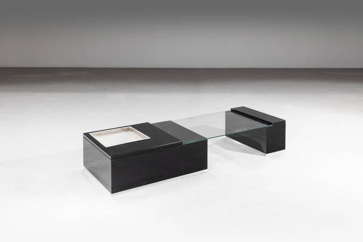 Struttura in legno laccato, vano portaoggetti in metallo cromato e piano in vetro.