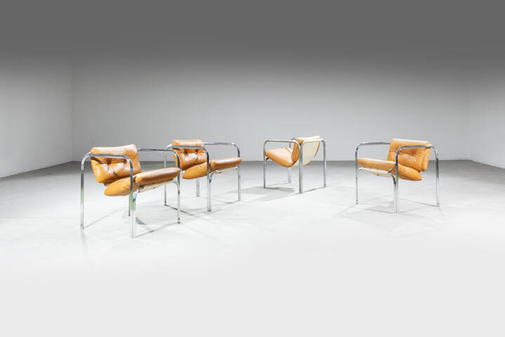 Struttura in acciaio, seduta e schienale imbottiti rivestiti in pelle.