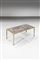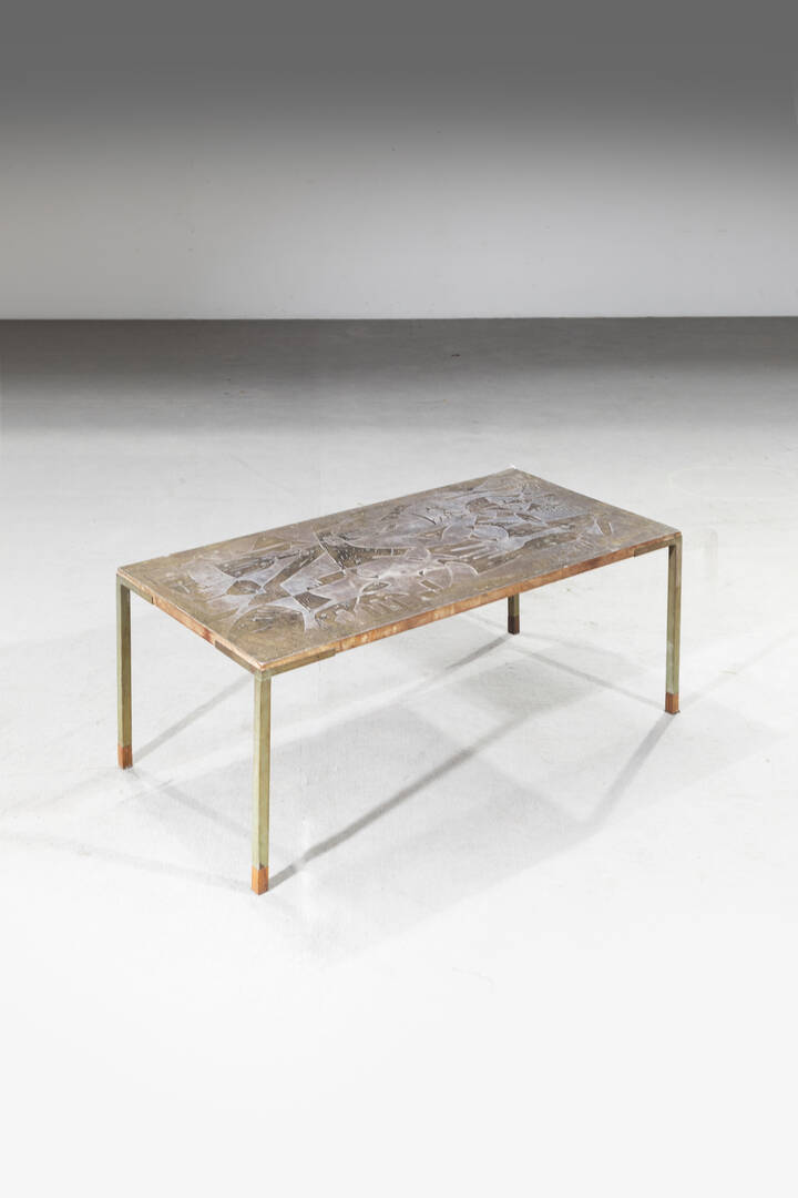 Struttura in metallo, piano in legno rivestito in lampiera lavorata.