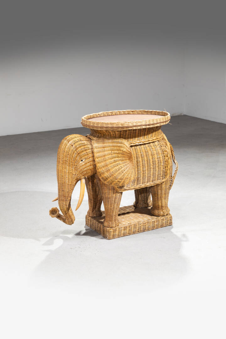 Tavolino/piedistallo a forma di elefante in rattan e legno.