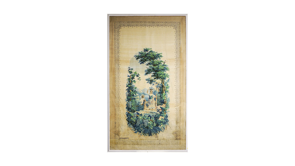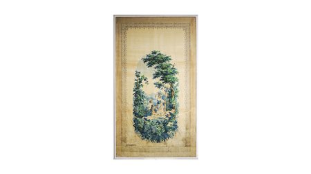 PANNELLO A GRISAILLE XIX secolo raffigurante scorcio di giardino con personaggi, in cornice, difetti, cm 228x128