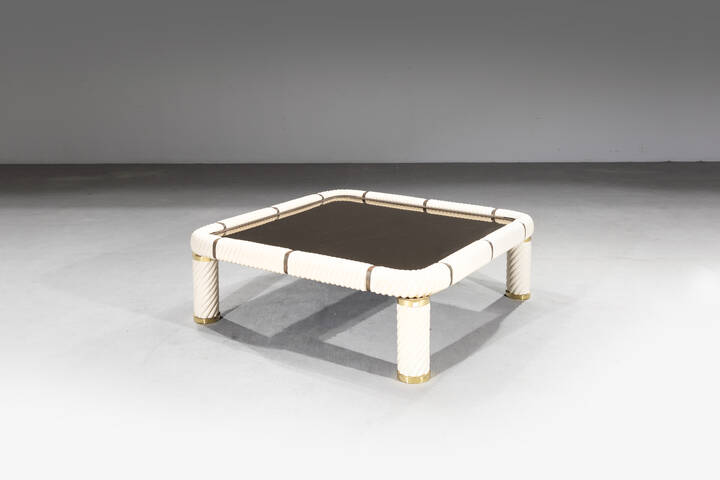 Struttura in ceramica bianca e ottone, piano in vetro specchiato.
