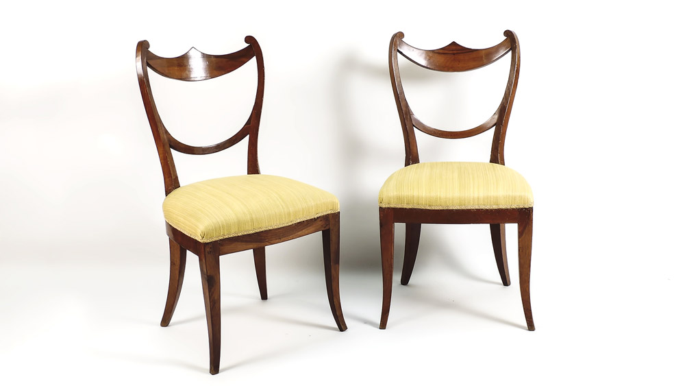 SERIE DI QUATTRO SEDIE IN NOCE fine del XVIII/inizio del XIX secolo schienale a scudo gambe a sciabola, seduta imbottita e rivestita in tessuto giallo oro A SET OF FOUR WALNUT CHAIRS LATE 18TH/EARLY 19TH CENTURY