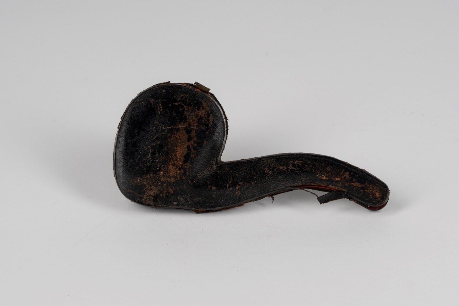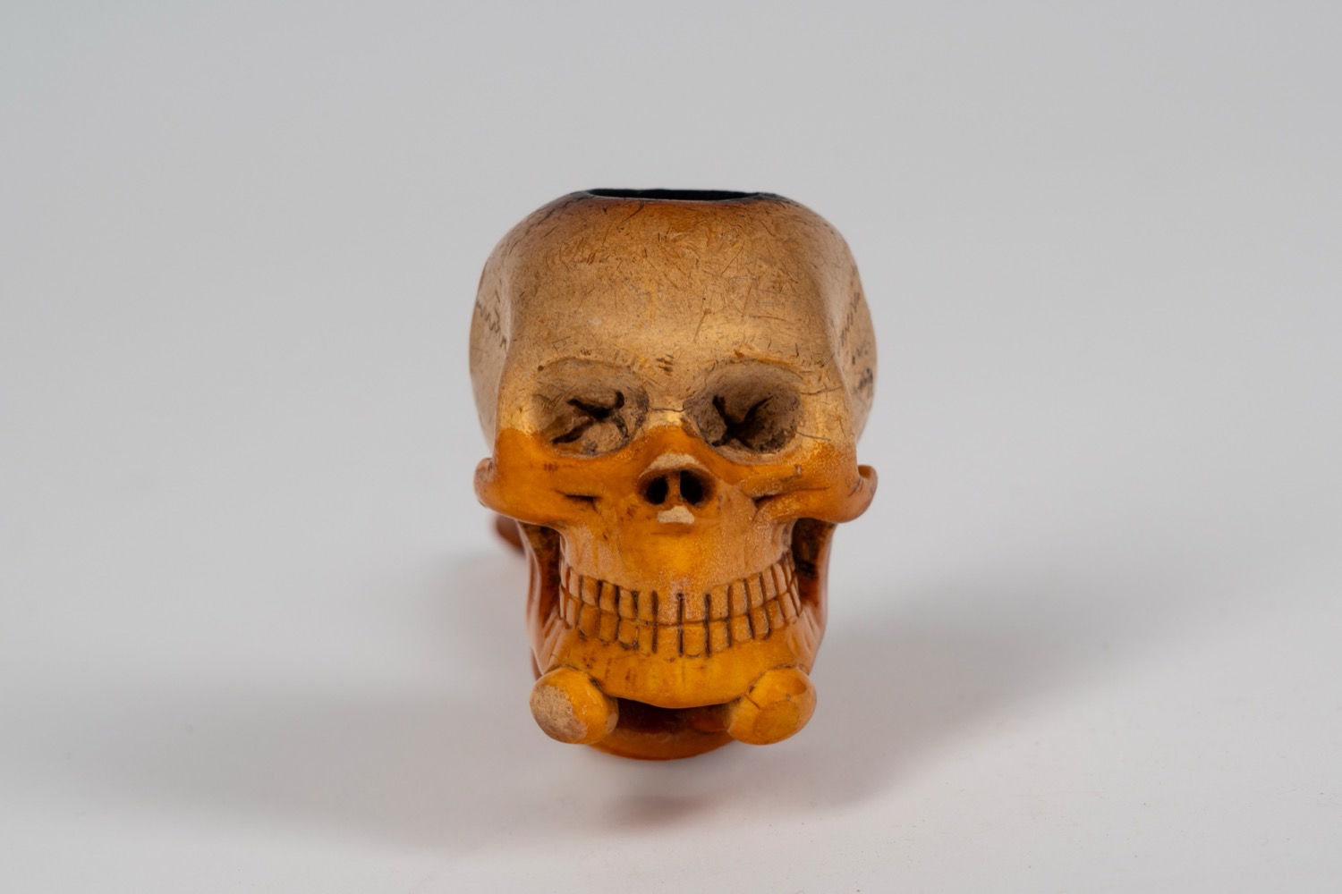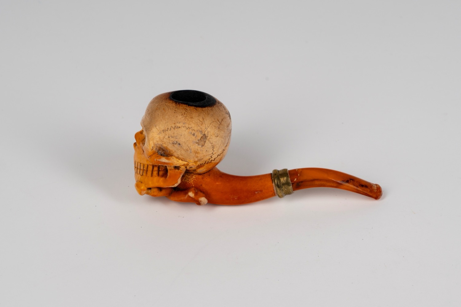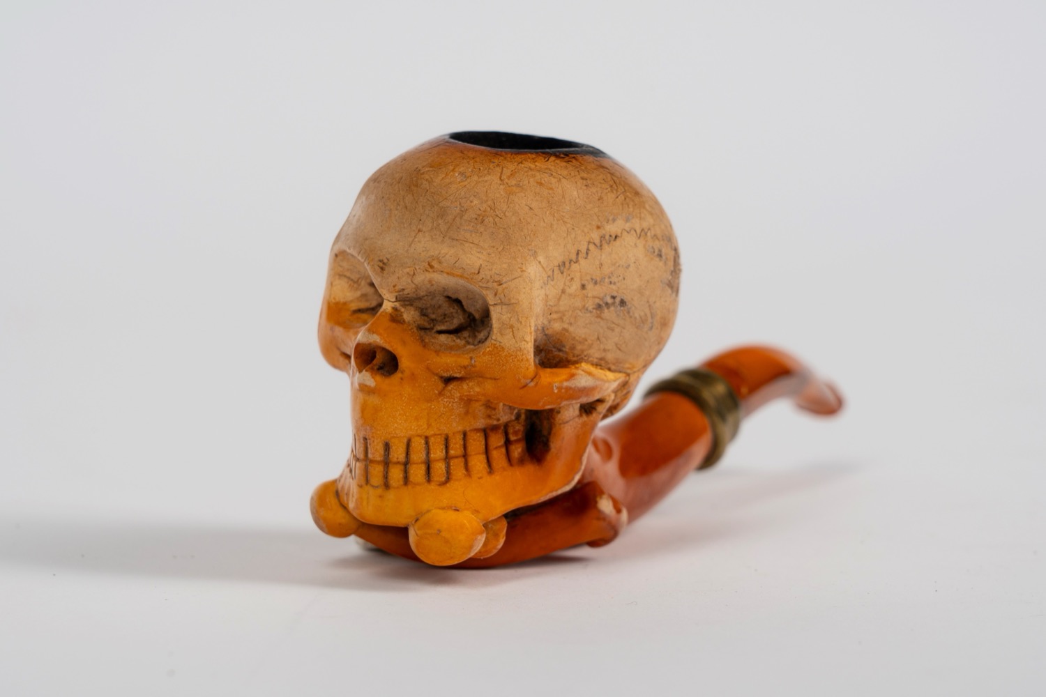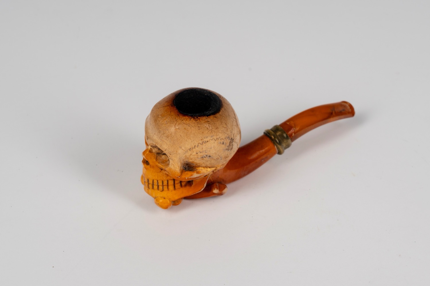 Pipa in schiuma di mare intagliata a forma di teschio entro custodia sagomata. Secolo XIX