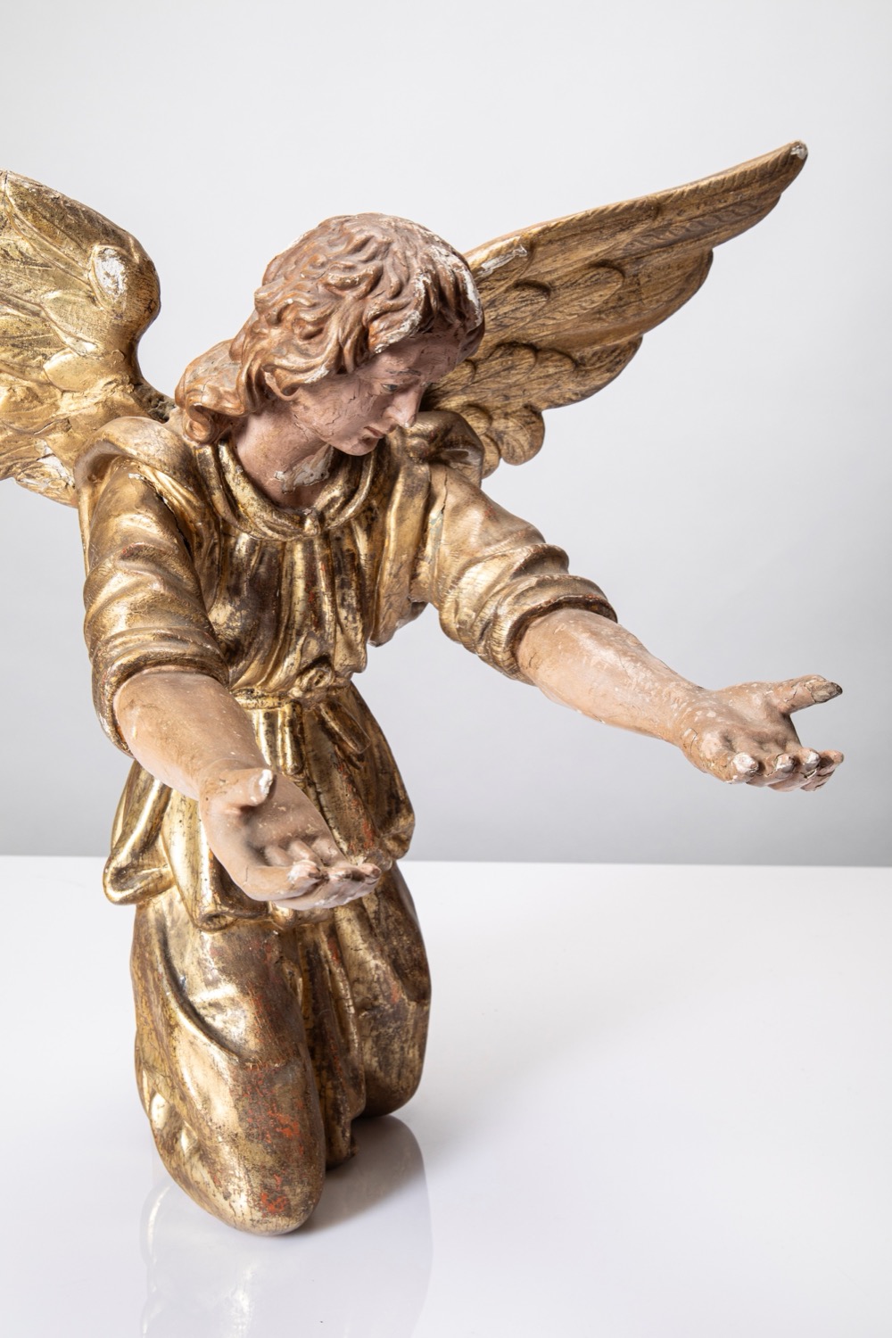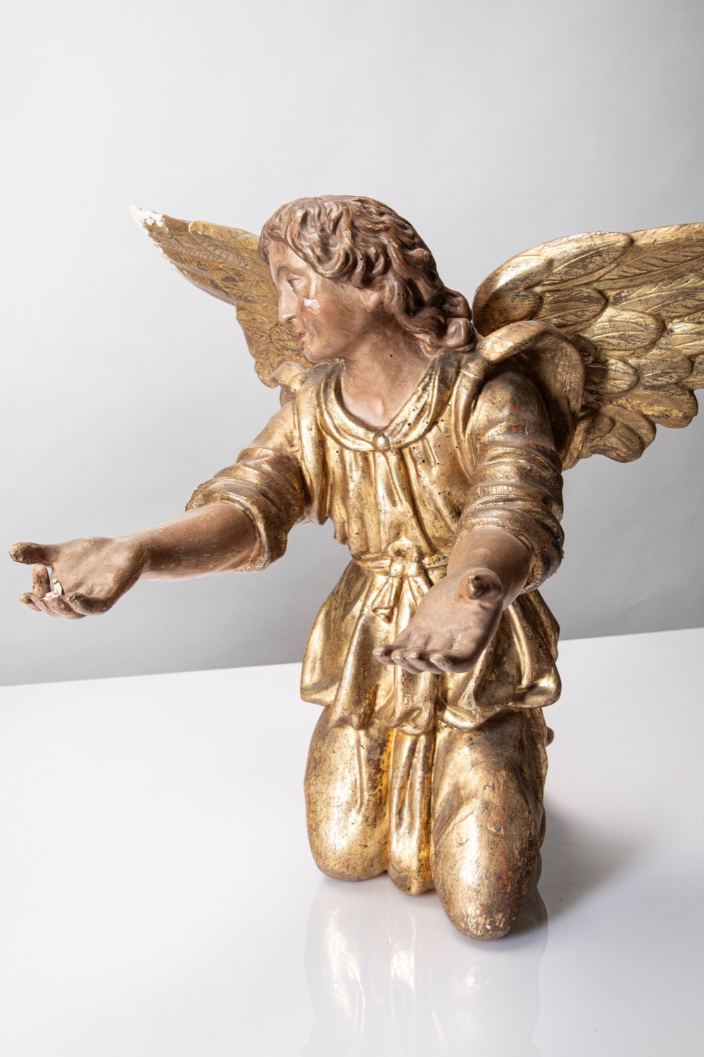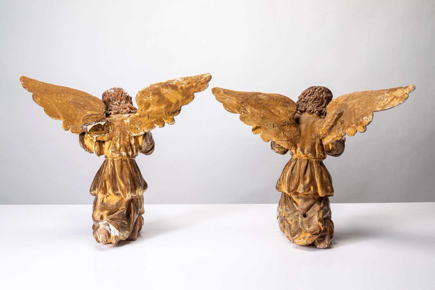 Coppia di angeli genuflessi in legno intagliato e dorato. Secolo XVIII