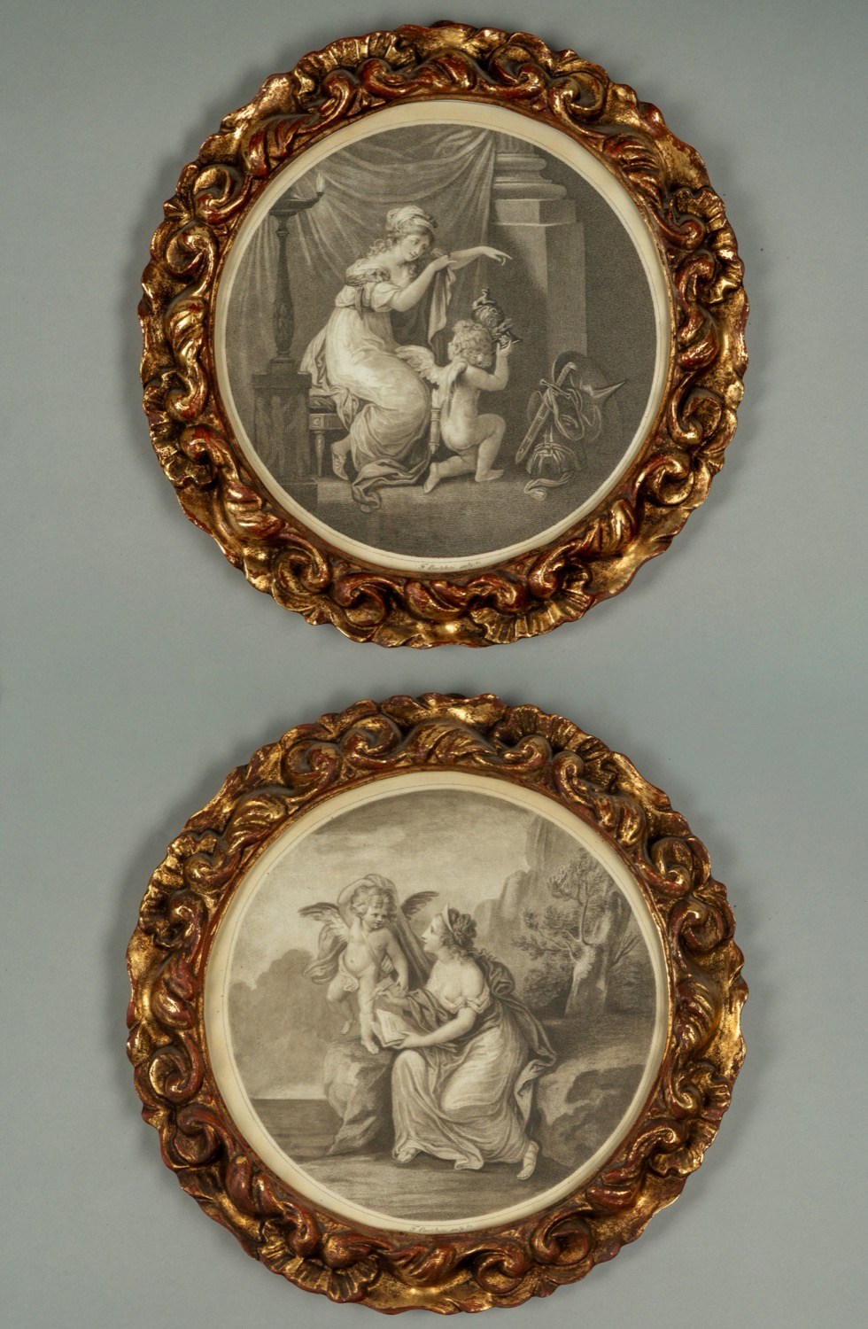 due incisioni di Francesco Bartolozzo (Firenze 1727 - Lisboa 1815) da Giovanni Battista Cipriani (1727 - 1785) entro cornici circolari in legno intagliato e dorato a volute e valve di conchiglie a rilievodue incisioni di Francesco Bartolozzo (Firenze 1727 - Lisboa 1815) da Giovanni Battista Cipriani (1727 - 1785) entro cornici circolari in legno intagliato e dorato a volute e valve di conchiglie a rilievo