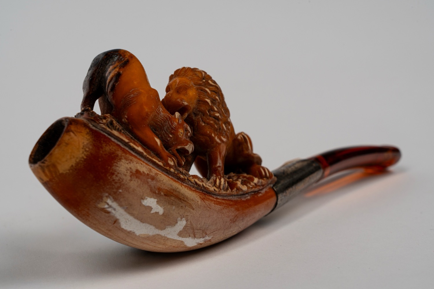 Bocchino in metacrilato. Anello in argento inciso. Sotto alla scena raffigurante leone e leonessa la pipa risulta rovinataBocchino in metacrilato. Anello in argento inciso. Sotto alla scena raffigurante leone e leonessa la pipa risulta rovinata