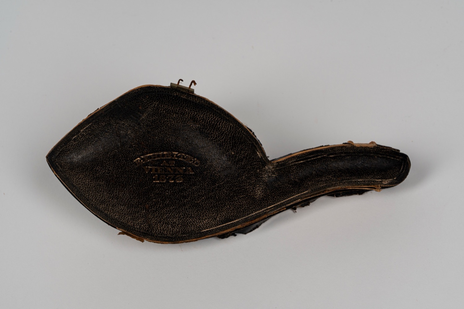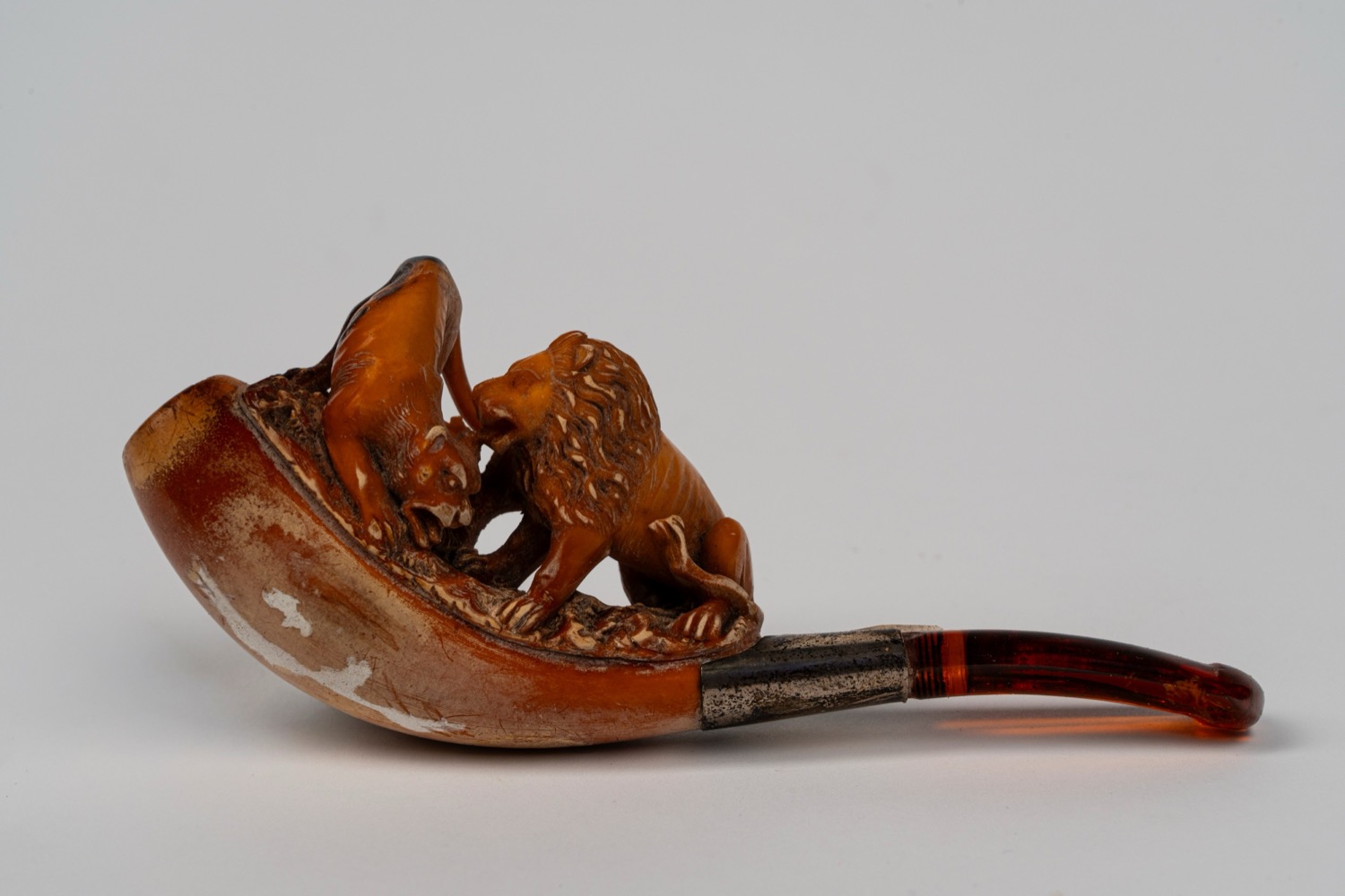 Pipa in schiuma di mare intagliata raffigurante un leone e una leonessa. Entro custodia sagomata. Secolo XIX