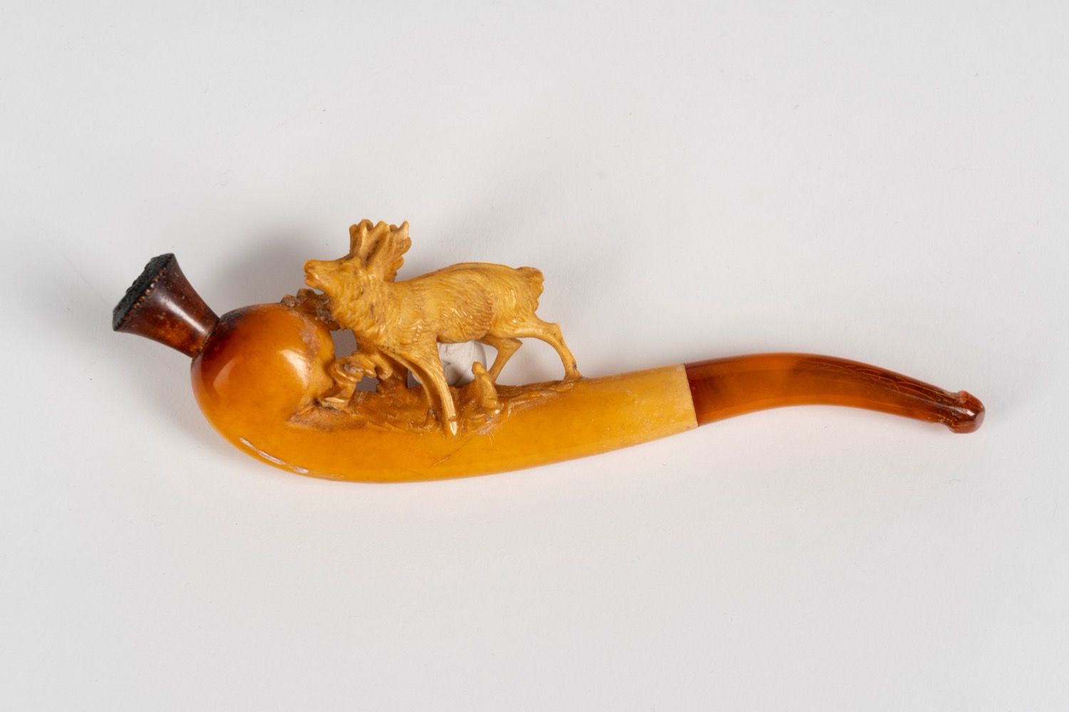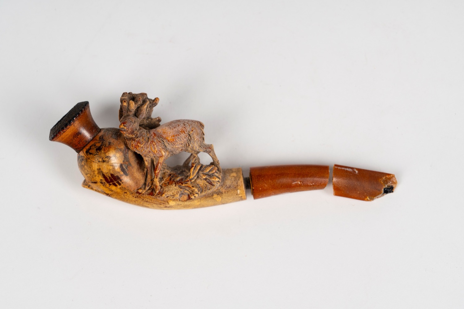 La quarta pipa si trova entro custodia sagomata e raffigura un cervo, bocchino in metacrilato rotto in più punti. Dimensioni: l cm 12, h cm 4.
